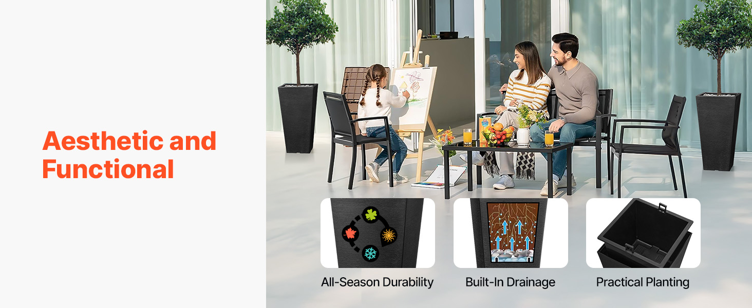 VEVOR Set of 2 Tall Outdoor Planters 22inch, Large Planters For Outdoor Indoor Plants, Black Tapered Square Front Porch Planters Flower Tree Plant Pots with Modern Design and Built-in Drainage