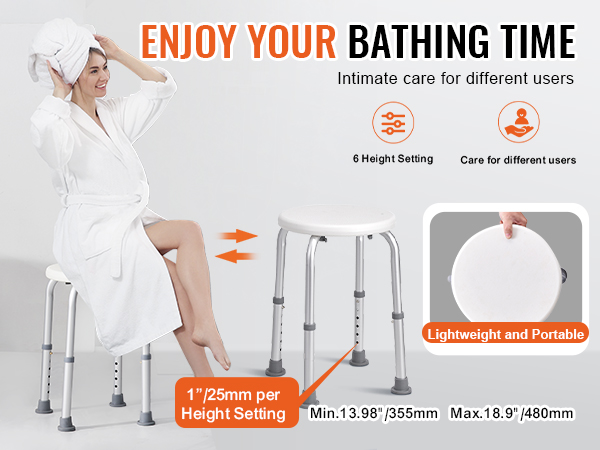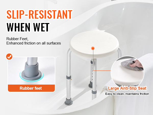Enjoy a safe seating experience in your bathroom, shower room, or bathtub. Our shower chair's non-slip foot pads enhance the friction and contact with the floor, eliminating the risks of standing for long periods or slipping while bathing.