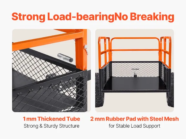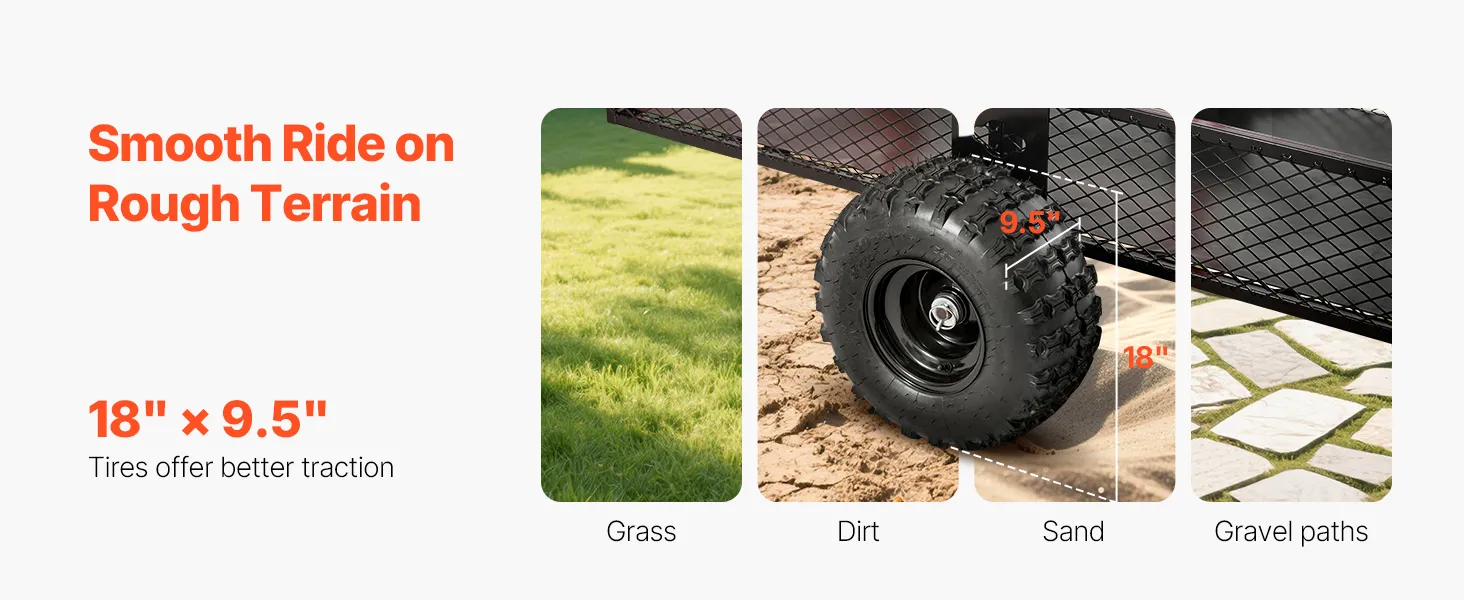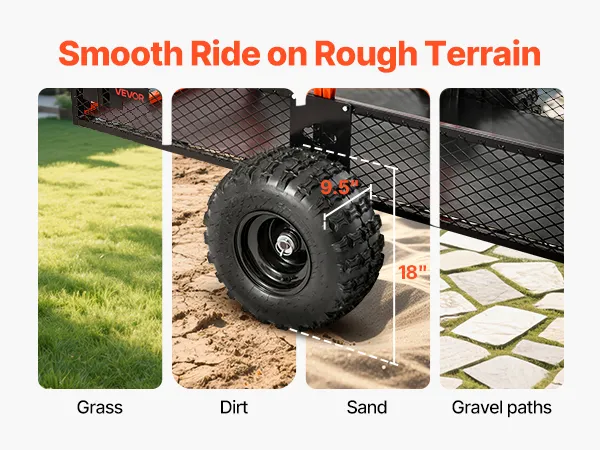 This 1800lb garden trailer fits tractors, ATVs, lawnmowers, and more. With a steel frame, rust-resistant coating, reinforced support rods, and pneumatic tires, it offers a 1800lb capacity and 18 cu.ft. of space. The 28" tires ensure smooth movement over grass and mud, for gardening and cleanup.