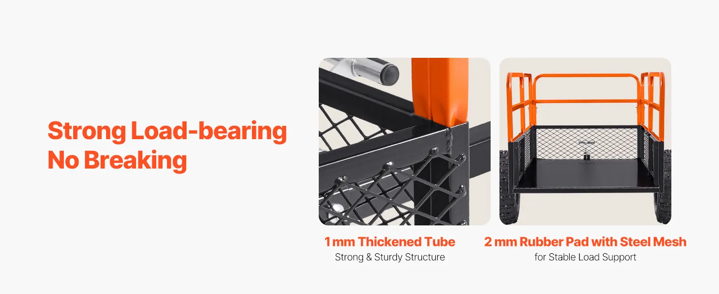 With a 28 cubic feet capacity, this garden cart is ideal for hauling gardening tools, wood, and soil. The three-sided guardrails prevent items from falling out, ensuring safe and easy transport for both large-scale gardening and routine maintenance.