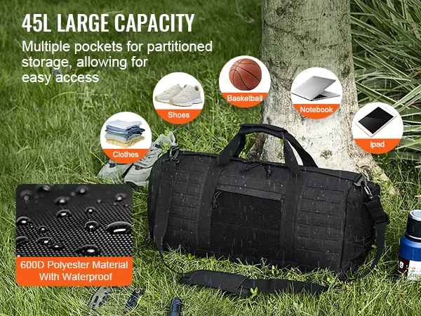 This tactical duffle bag can be used as a hand-carry bag or a shoulder bag, with a capacity of 45L. It can hold gym equipment, clothes, shoes, basketballs, and other items needed for sports and travel. Made from breathable, lightweight, waterproof, and scratch-resistant materials.