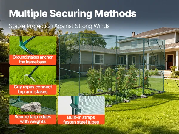 This plant protection tent includes multiple securing methods. The ground stakes anchor the frame at the base, while guy ropes tighten the top to the ground, creating a stable 3D support. The extended edges can be weighted down, and built-in straps fasten the cover to the steel frame tube.