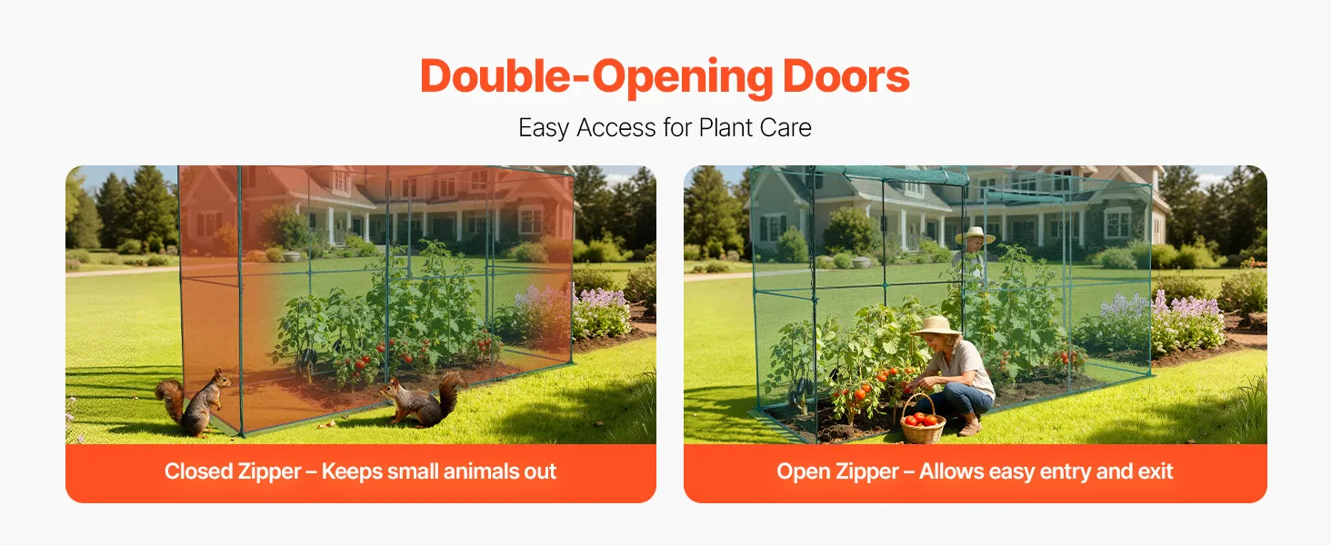 Equipped with convenient double-opening doors, this plant cage provides great ease for plant care. Zip closed to form a secure barrier against small animals, or unzip to easily access your plants for hassle-free plant care.