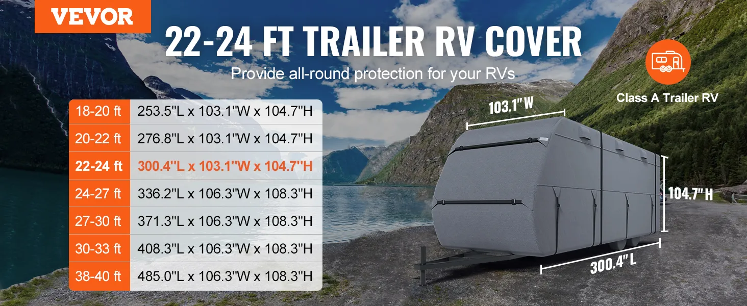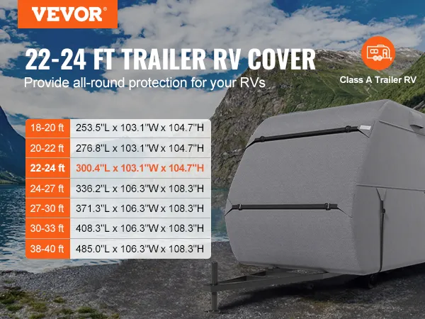 Our Class A travel trailer cover is meticulously designed to fit 22'-24' RVs, providing a snug protective fit. For proper installation, please ensure accurate measurements of your RV. We also provide various RV cover sizes to meet your specific needs.