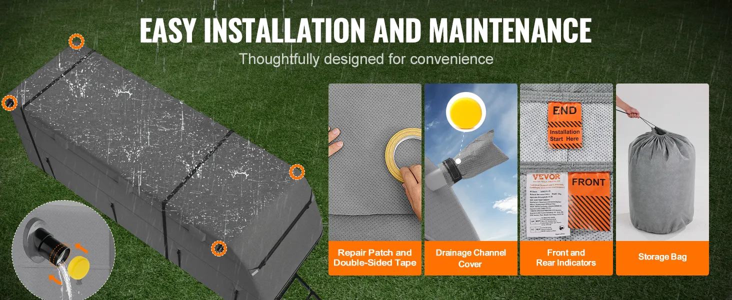 The RV travel trailer cover is equipped with sponge drainage covers, avoiding puncturing for RVs with drainage systems. It features "FRONT" and "END" labels for easy identification during installation. Damage can be quickly repaired with the provided double-sided tape patch.