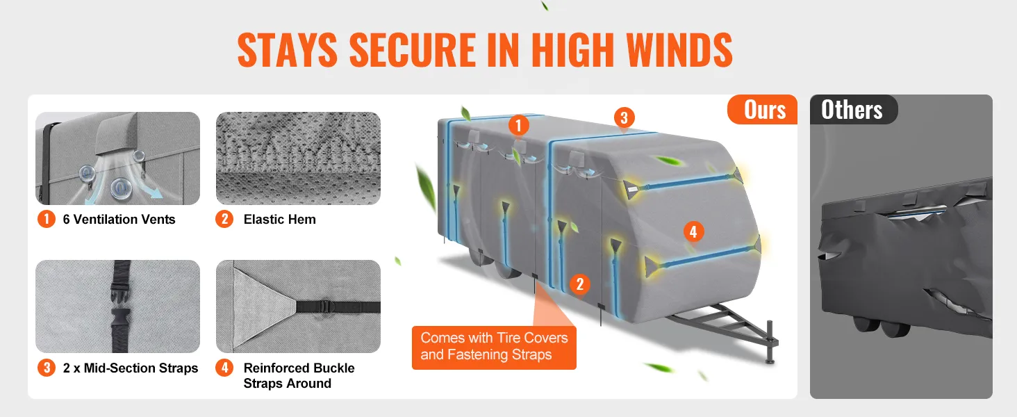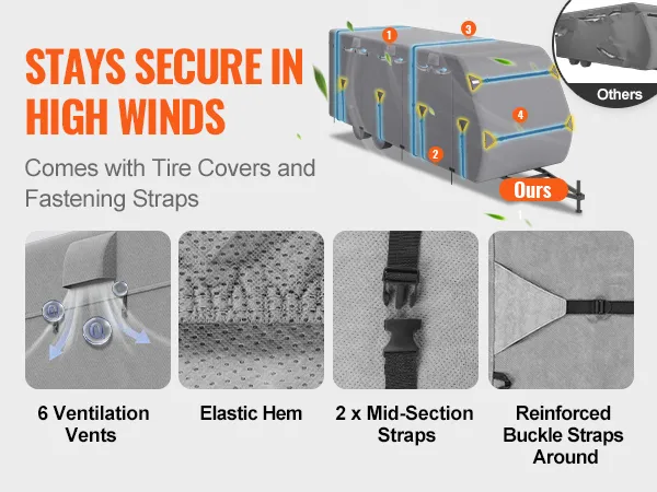 The 6 ventilation ports help release strong airflow, while the full surround buckle and strap system keeps the RV covers for travel trailers in shape. This design prevents the cover from ballooning in strong winds and avoids tearing or blowing off.