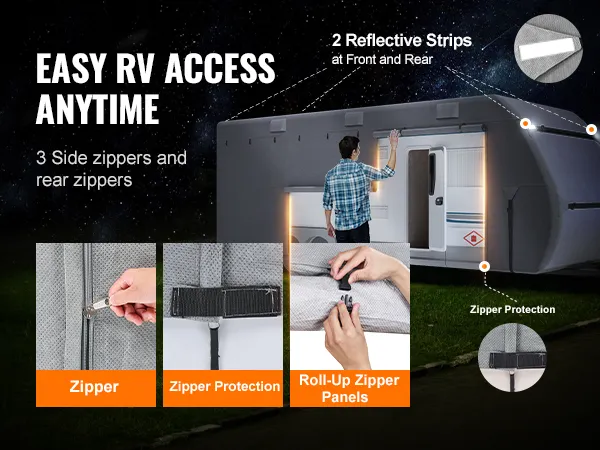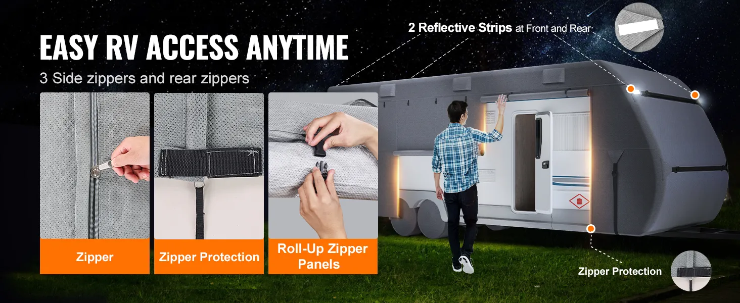 The side and rear zipper doors of the camper cover provide easy access to your RV. The zipper's bottom is reinforced with widened Velcro, and reflective strips on the front and back enhance visibility at night and in snow, ensuring your RV is easily seen.
