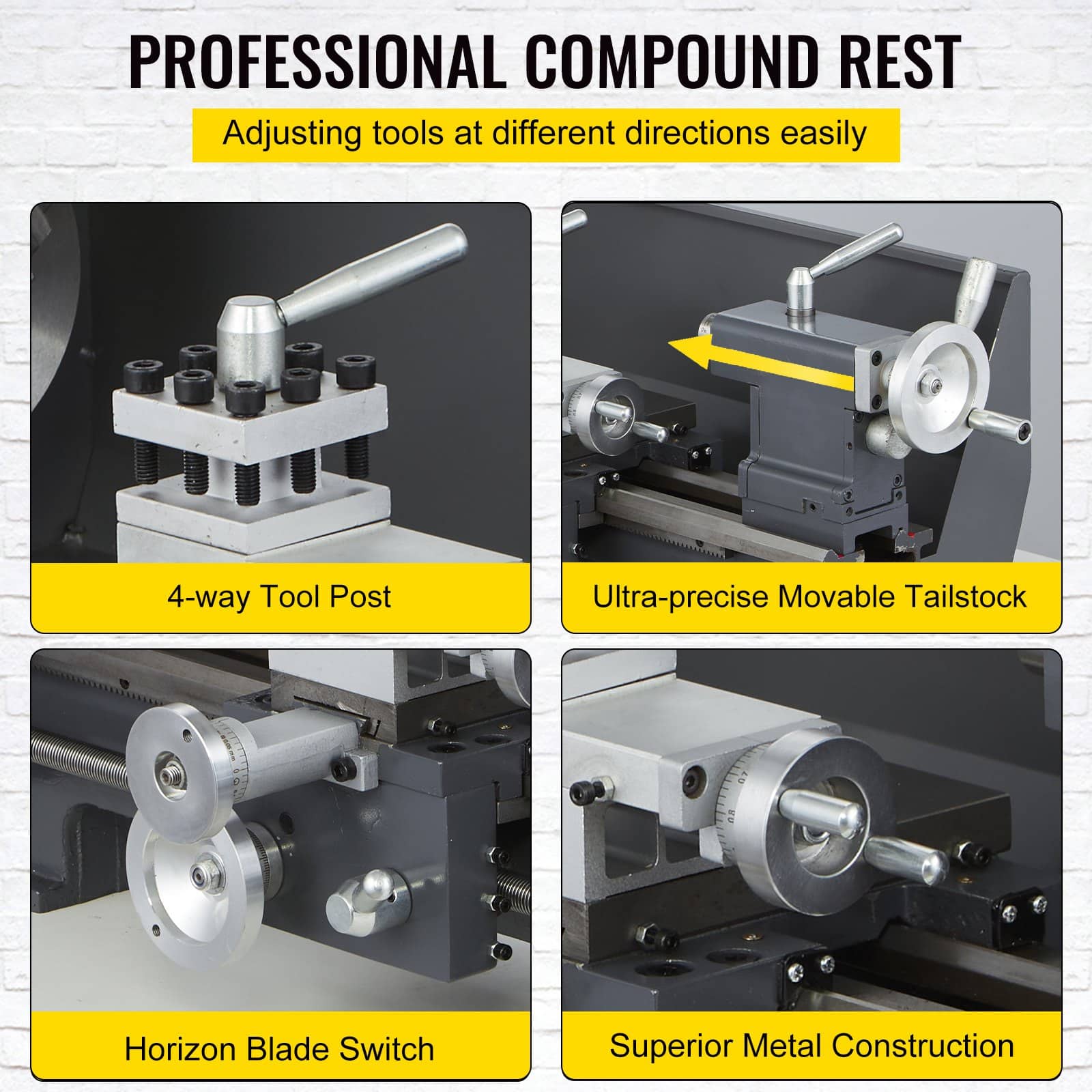 VEVOR Updated 750W Mini Metal Lathe 8x16 Inch Metal Lathe with Luxury Accessory Box, 50-2500PRM Infinitely Variable Speeds MT3 Spindle Taper Metal Lathe Machine with Movable Lamp 4-jaw Chuck 9 Cutters