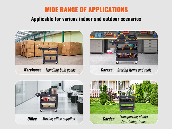 VEVOR heavy-duty rolling trolley can work outdoors/indoors and help you organize easily and store trivial things. Great for home, work, garages, warehouses, schools, restaurant, garden, library, office, and so much more.