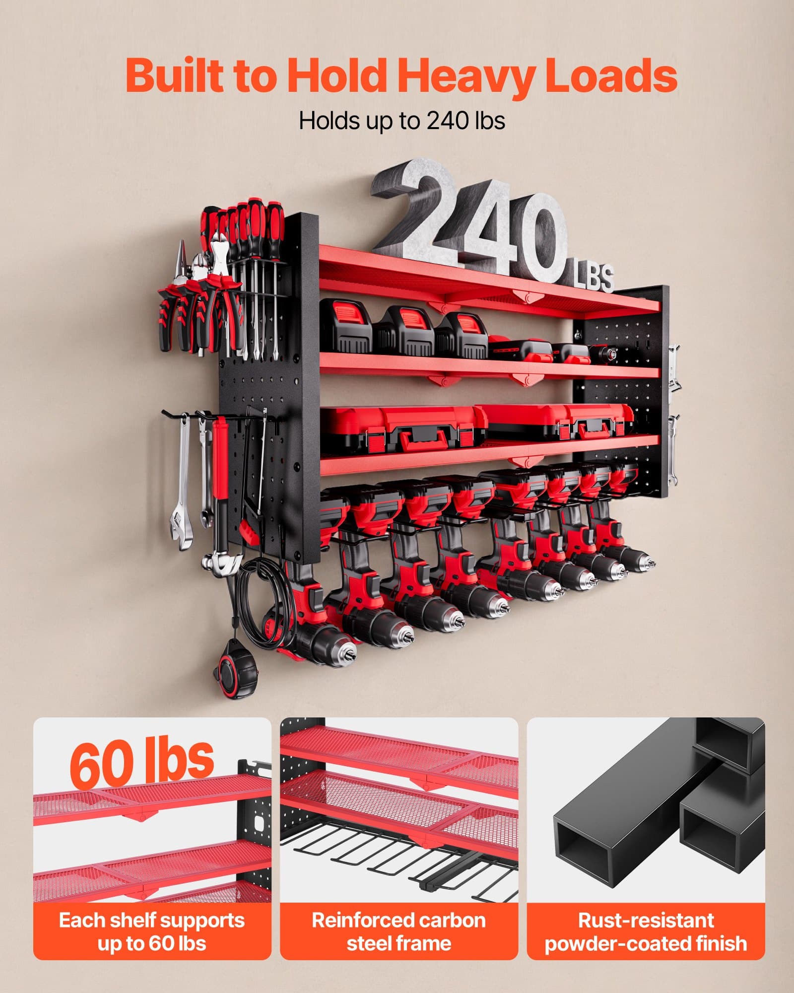 This wall-mounted 4-tier power tool organizer offers quick, grab-and-go access. Its sturdy carbon steel frame supports up to 240 lbs, making it easy to store drills, toolboxes, and more for a tidy, worry-free workspace.
