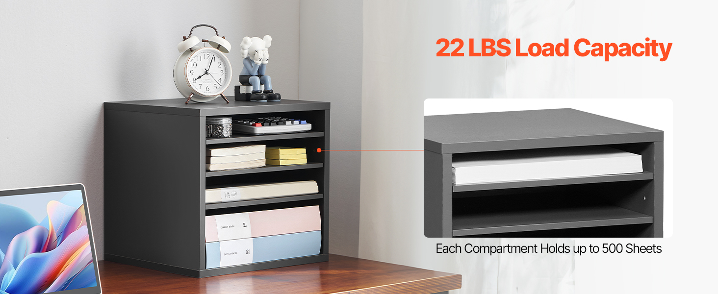 VEVOR 5-Compartment Wooden Literature Organizer, Adjustable MDF Mail Sorter for A4 Files, Home Office Storage, Grey