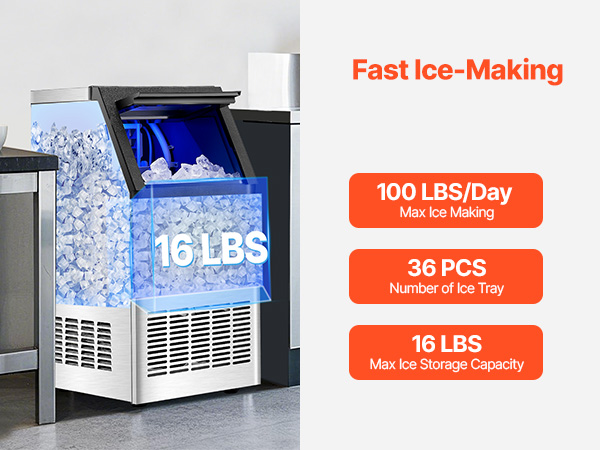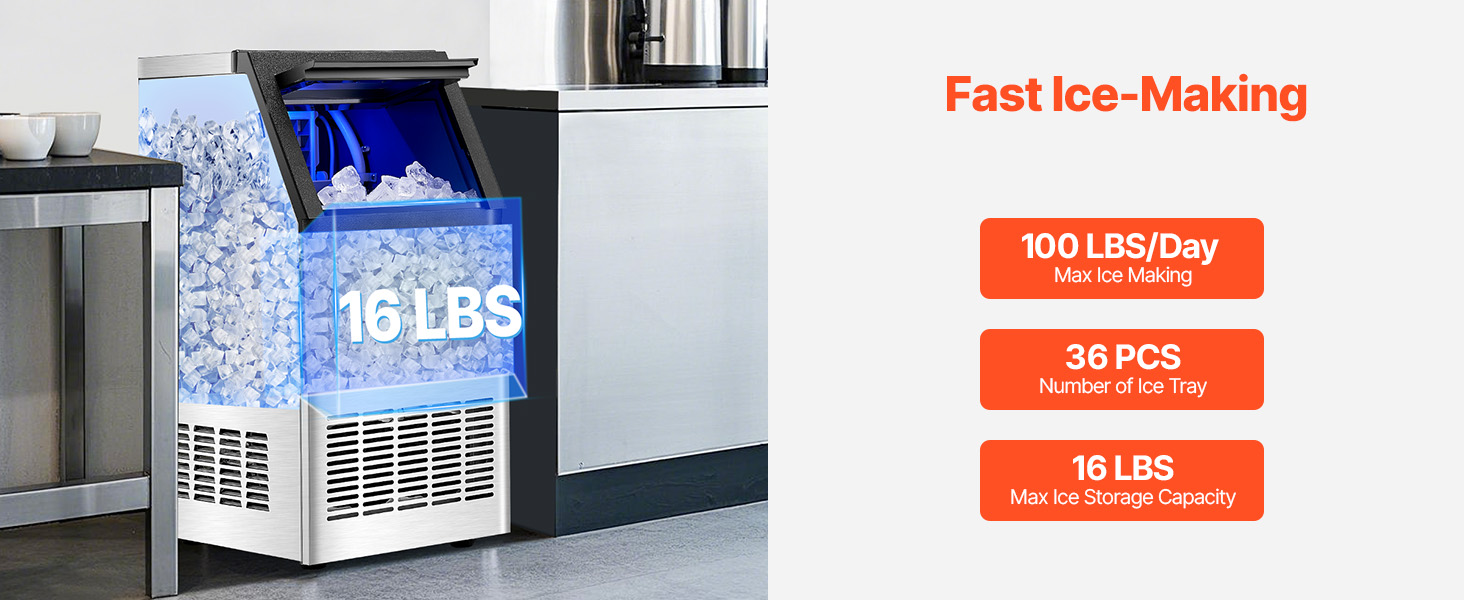 VEVOR Commercial Ice Maker Machine, 100lbs/24H Ice Maker Machine with 16lbs Storage Capacity, 36 Ice Cubes in 15 Minutes, LED Digital Display Freestanding Self-Cleaning for Bar Office Restaurant