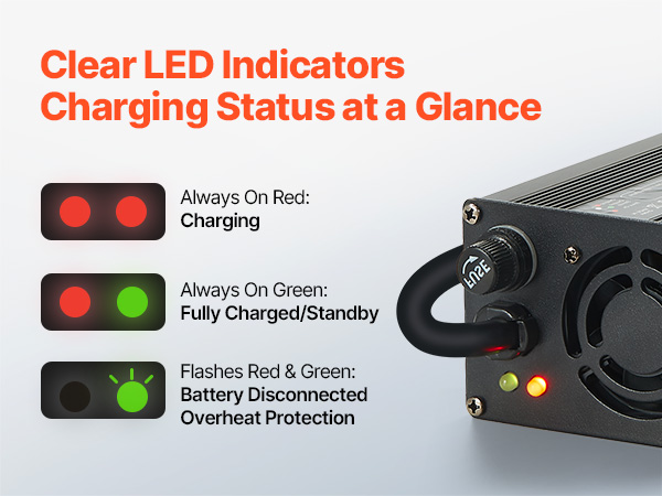 • 3-astmeline Intelligentne Laadimine: Kurvi Meie LiFePO4 laadija auto tuvastab teie aku staatus. CC etapil: kiire laadimine, CV etapp: vältida ülemäärast hinda, kui aku on täis laetud etapp: säilitada aku on täis laetud. LED indikaatorid võimaldavad teil kiiresti kontrollige aku olekut