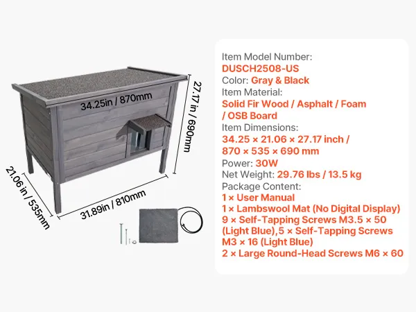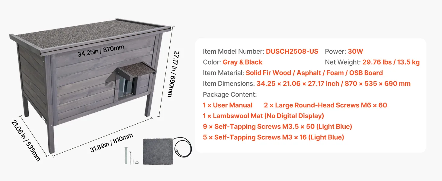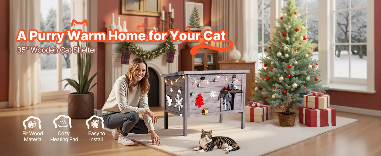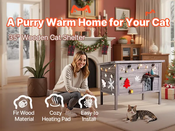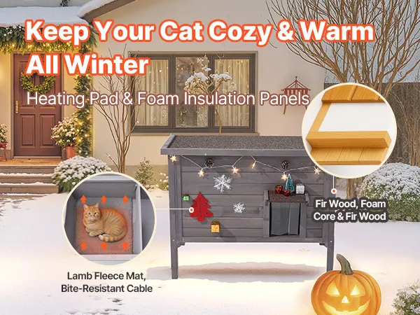 Made from durable and sustainable fir wood, the heated cat house offers a cozy and secure shelter for cats. Includes a heating pad to keep cats warm and comfortable even in harsh winters.