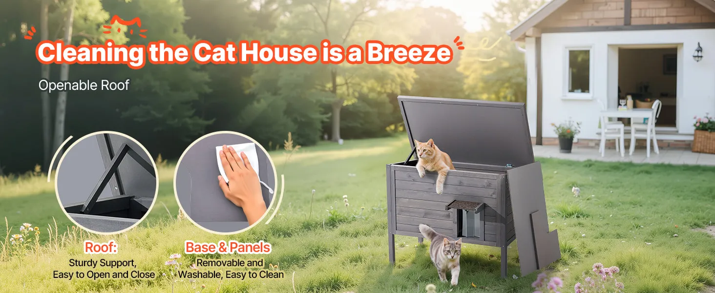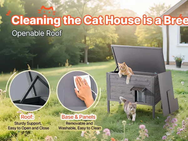 Our outdoor cat shelter with hinged roof for quick access; removable floor and panels can be washed, making maintenance simple and hygienic.