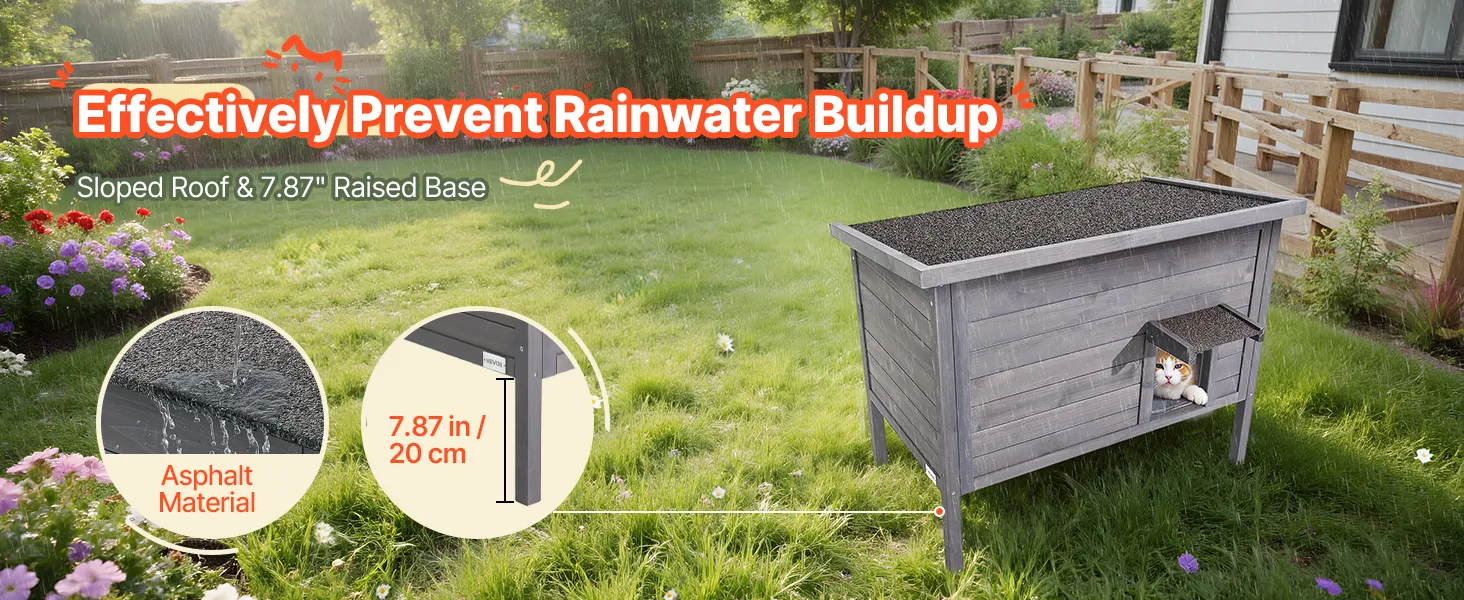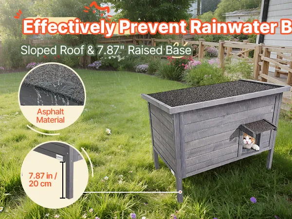 The feral cat house with sloped asphalt roof prevents water buildup. 7.87" (20 cm) raised base keeps out ground moisture and cold.