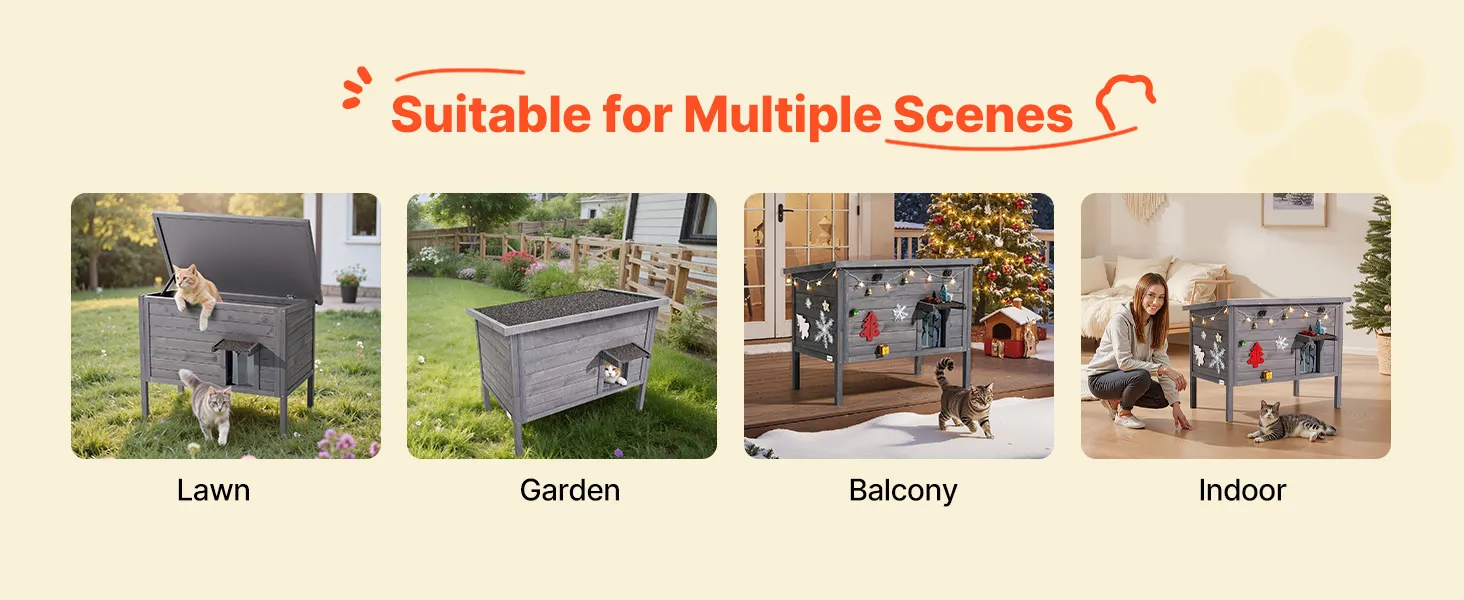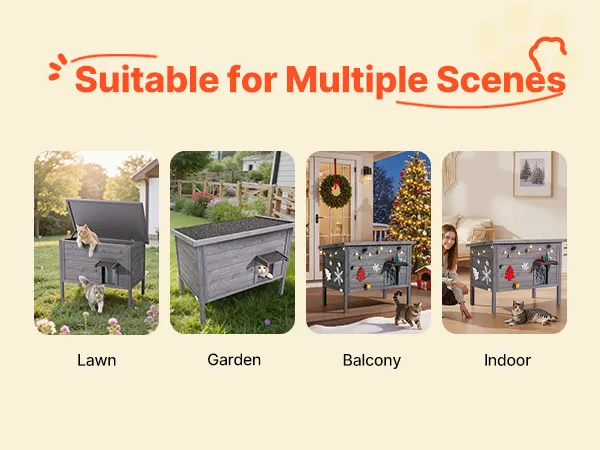 This elevated cat house is ideal for outdoor spaces like lawns, gardens, patios, or indoors as a private cat corner. It is a great cat home for both indoor pet and outdoor use for stray cats.