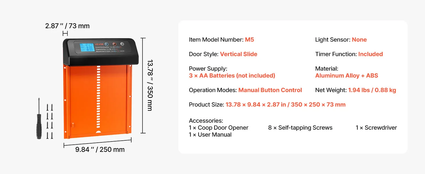 VEVOR automaatne kanakuudi uks, patareitoitel, taimeri ja käsirežiimiga, turvafunktsioon, veekindel, oranž