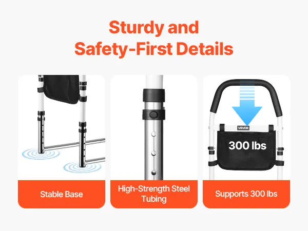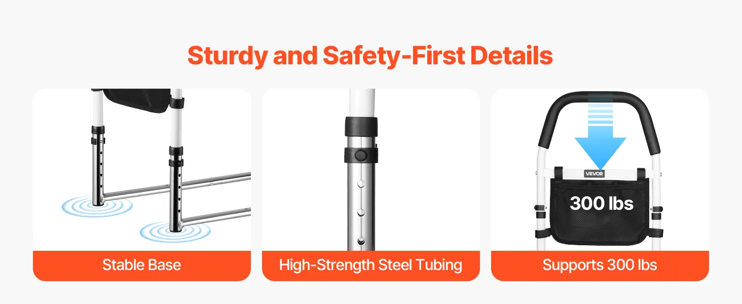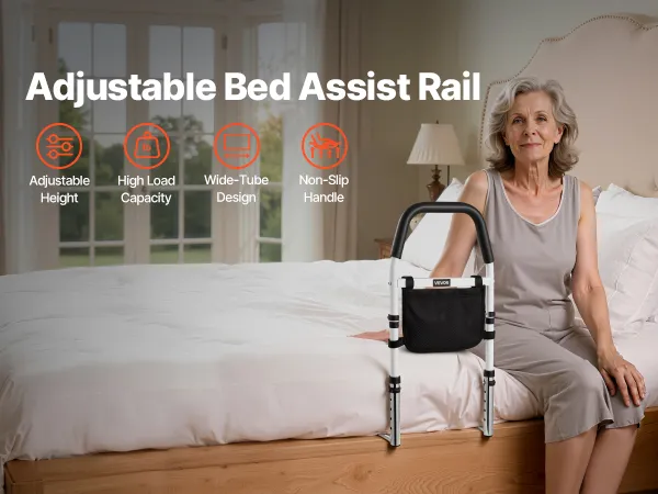 VEVOR Bed Rail for Elderly, Bedside Assist Rails with PU Handrail, Adjustable Height Pipe Bedside Cane, High-Strength Carbon Steel Bed Bars for Seniors & Patients, Fits King, Queen, Full, Twin