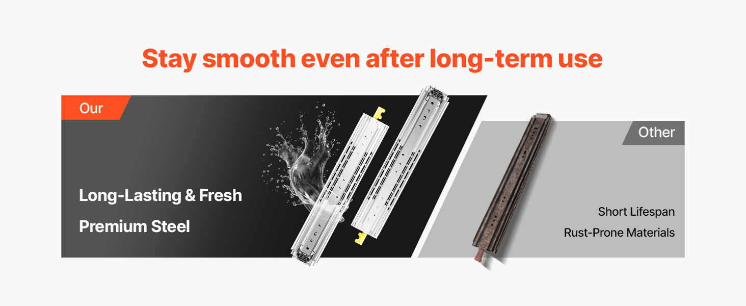 • Topelt Lukustus Disain: väljatõmmatavad kummut sahtli slaidid on varustatud kahe puldiga disain, mis lukustab slaidid lihtsa vajutage, tagades, et teie üksused on turvaline ja ei tõsta välja isegi auklik teed.