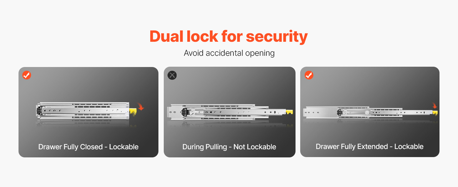 VEVOR 1 Pair Full Extension Drawer Slides 18 20 22 28 30 32 36 38 40 44 48 52 56 60 in, 500 lbs Load Capacity Locking Drawer Slides, Ball Bearing with Lock Side Mount Drawer Slide Rail