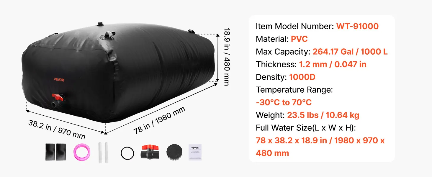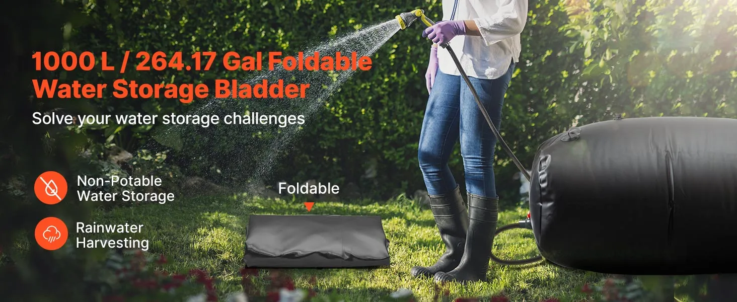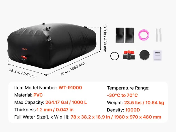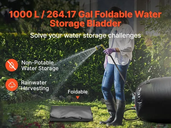 This VEVOR 264 Gallon/1000L collapsible water storage bladder is crafted from tough 1000D double-layer PVC material, providing superior durability. Its strong sealing and leak-proof construction ensures reliable water storage for outdoor adventures, home use, gardening, or emergencies.