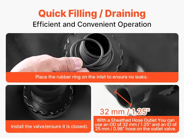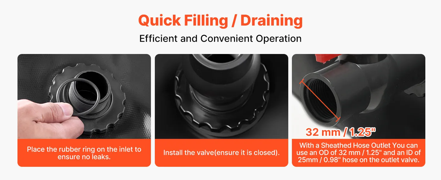 Our collapsible water storage container features large-diameter inlets and outlets, ensuring smooth water flow and easy compatibility with various hoses and high-pressure cleaners. Perfect for home use, camping, and other outdoor activities.