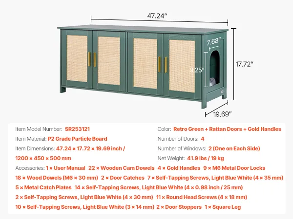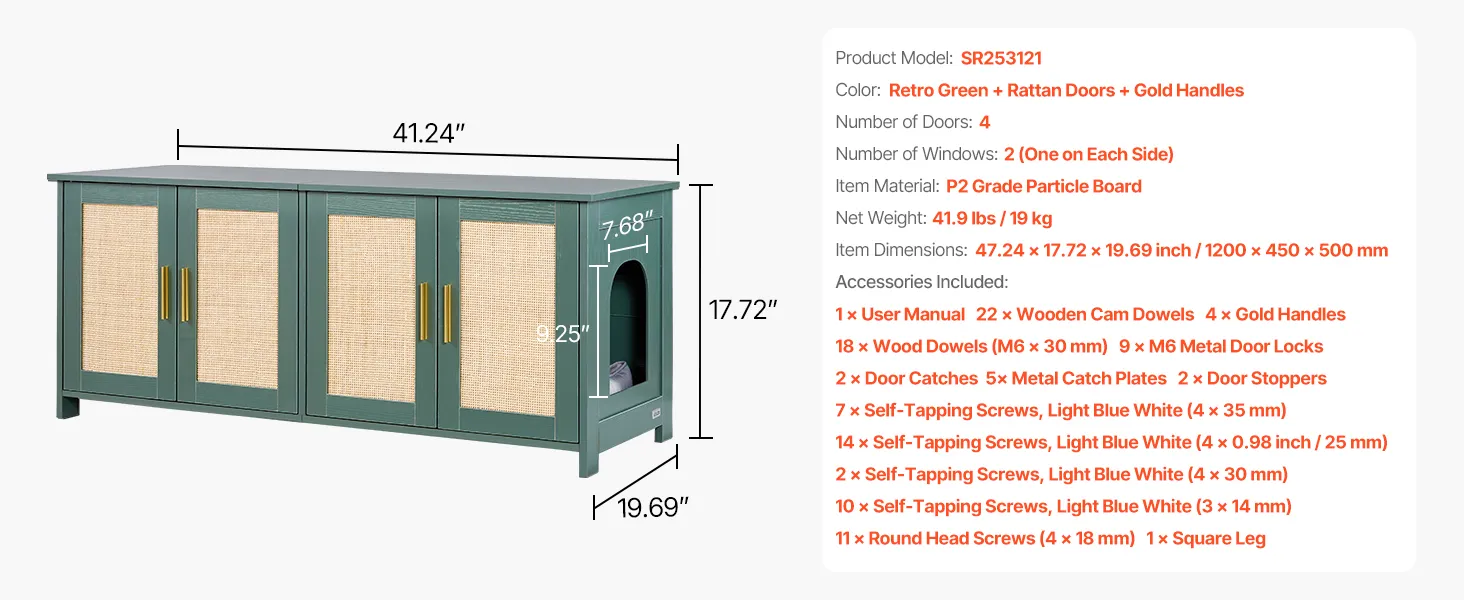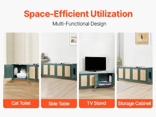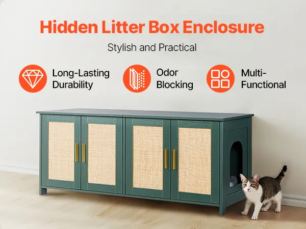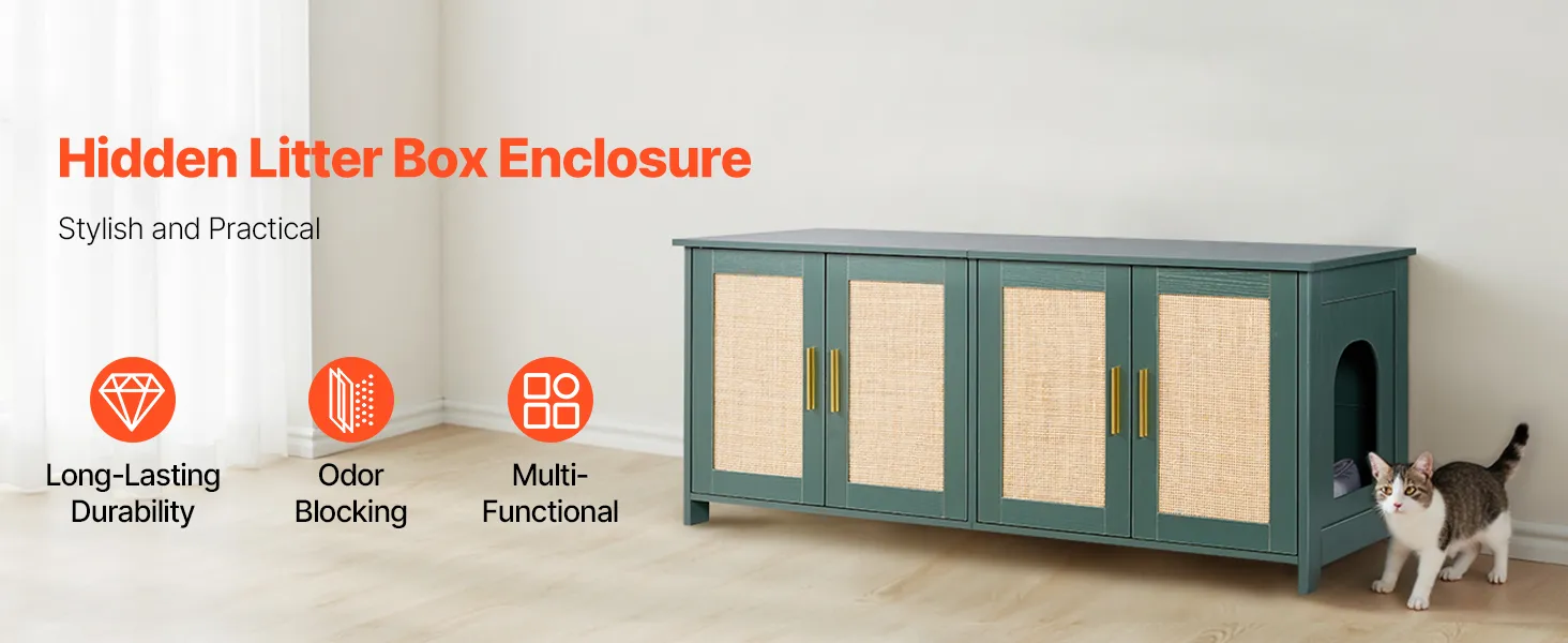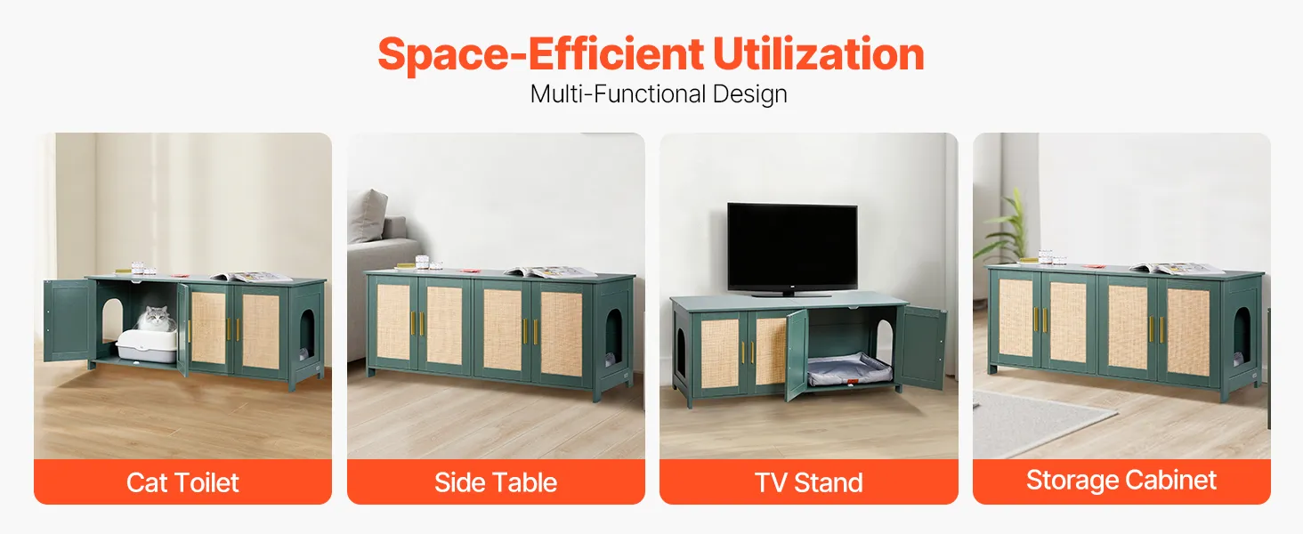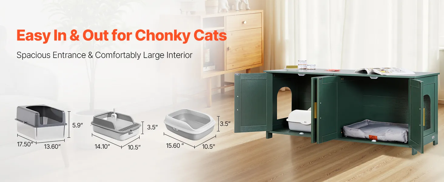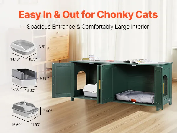 Measuring 47.24 × 17.72 × 19.69 in, the roomy interior accommodates various litter box sizes and cat beds. This wooden litter box enclosure is ideal for multi-cat homes, it offers more freedom of movement to reduce conflicts and improve litter box acceptance.