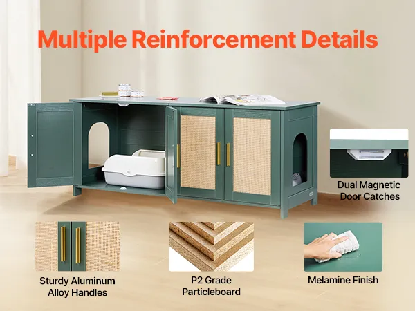 Made with P2-grade safe, durable panels, a metal latch, and aluminum alloy handles. The melamine finish is scratch-resistant, waterproof, and easy to clean. Magnetic door closures keep the cabinet securely shut, preventing cats from opening it and containing odors.