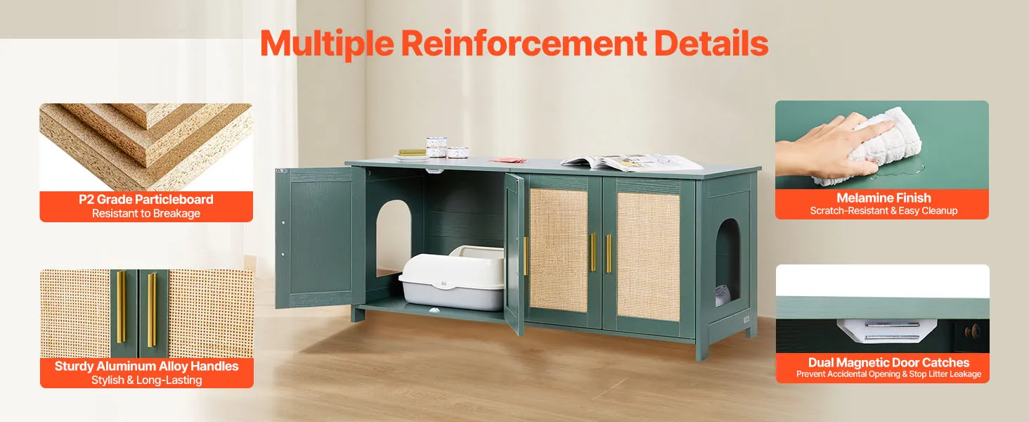 VEVOR Cat Litter Box Enclosure for Multi Cats, 120 cm Hidden Litter Box Cabinet with 4 Rattan Doors & 2 Entries, Indoor Cat Washroom, Wooden Kitty House Furniture, Fit Most Litterboxes, Green