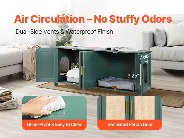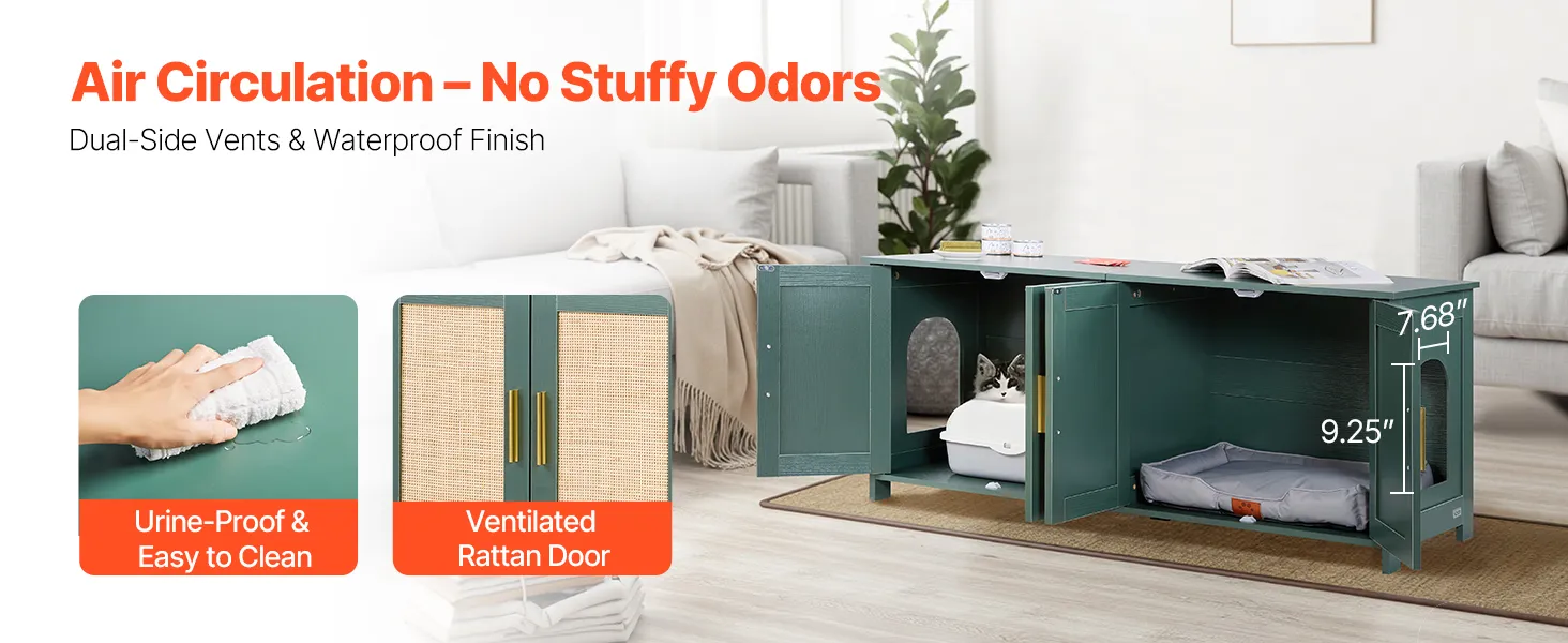 Dual side ventilation windows (9.25"×7.68") paired with ventilated rattan-woven door panel, promote airflow to keep the inside dry and fresh. The waterproof, stain-resistant surface prevents urine penetration, making cleaning quick and easy.
