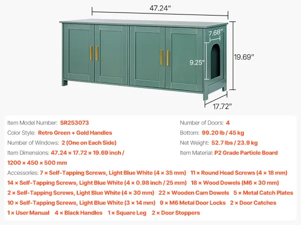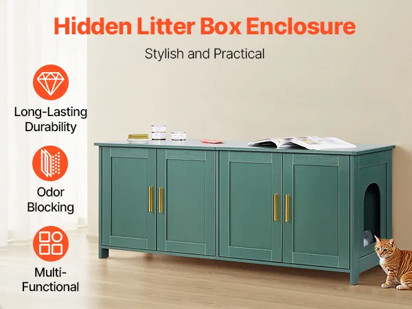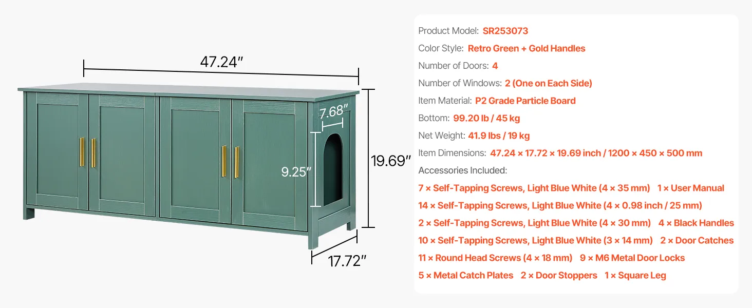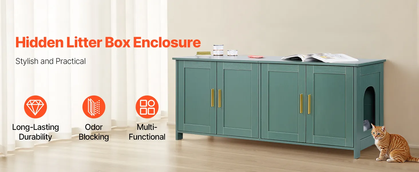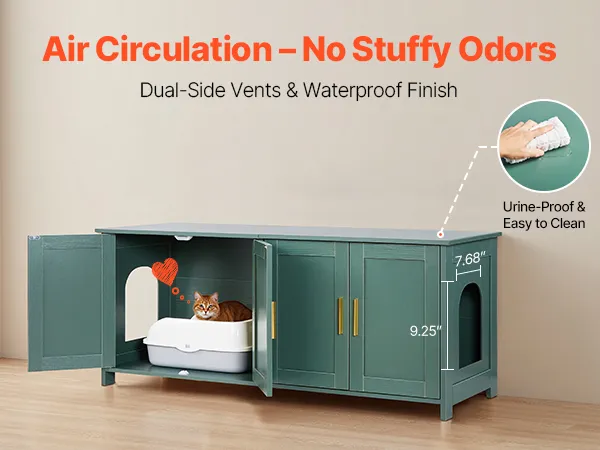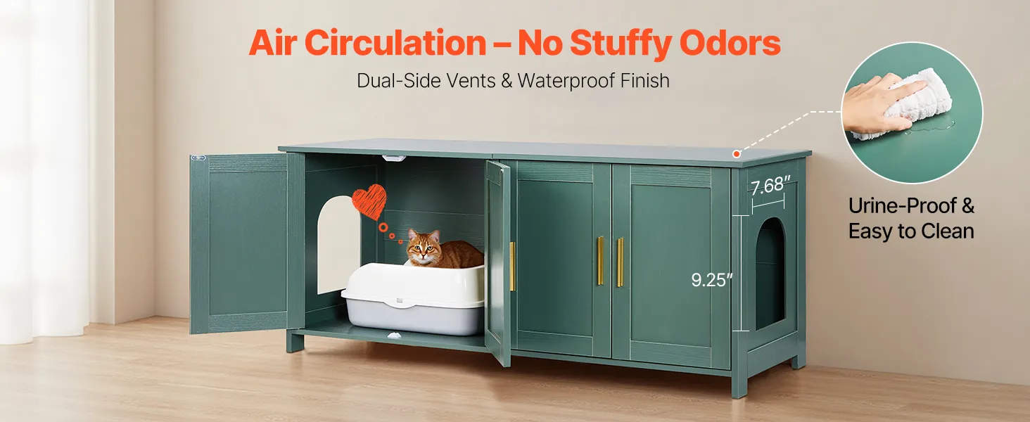 Measuring 47.24 × 17.72 × 19.69 in, the roomy interior accommodates various litter box sizes and cat beds. This wooden litter box enclosure is ideal for multi-cat homes, it offers more freedom of movement to reduce conflicts and improve litter box acceptance.