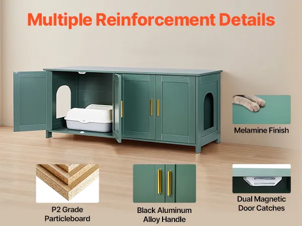 Made with P2-grade safe, durable panels, a metal latch, and aluminum alloy handles. The melamine finish is scratch-resistant, waterproof, and easy to clean. Magnetic door closures keep the cabinet securely shut, preventing cats from opening it and containing odors.