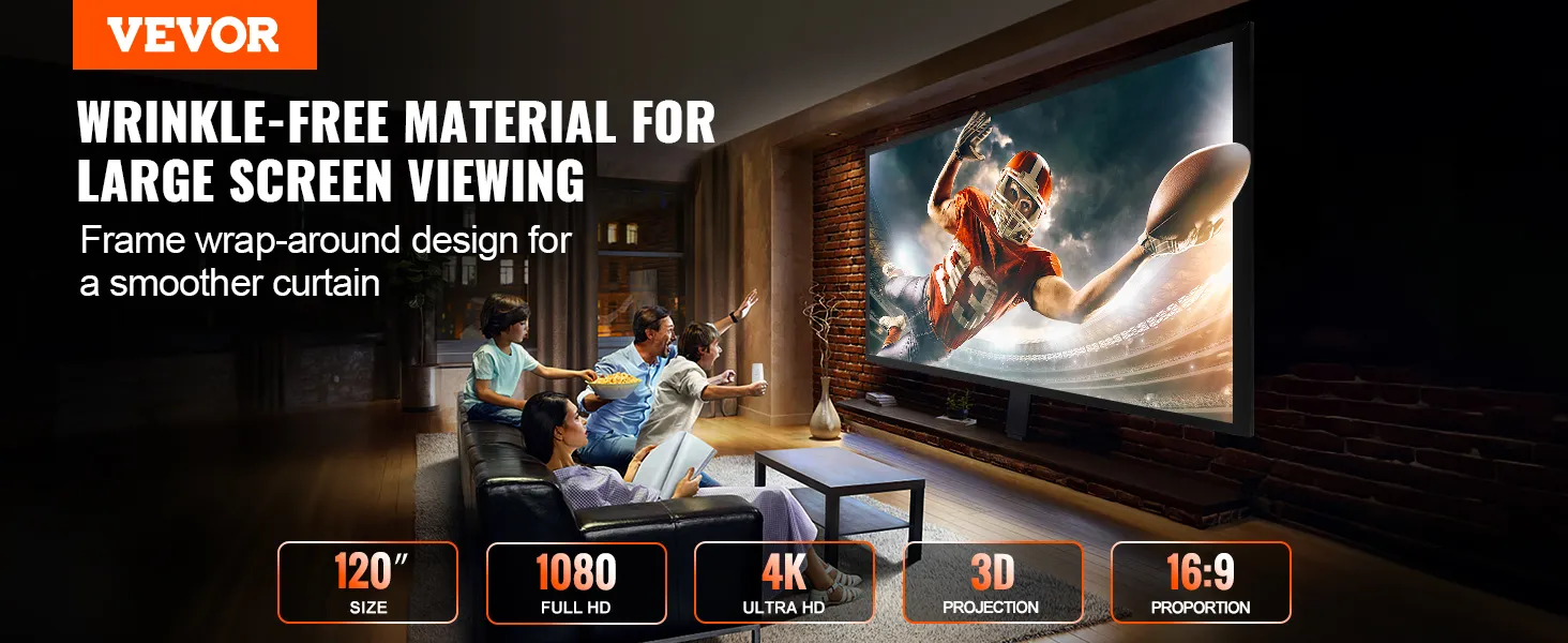 VEVOR 120Inch Projection Screen 16:9 4K HDTV Movie Screen Fixed Frame 3D Projector Screen for 4K HDTV Movie Theater Outdoor Use(120inch)