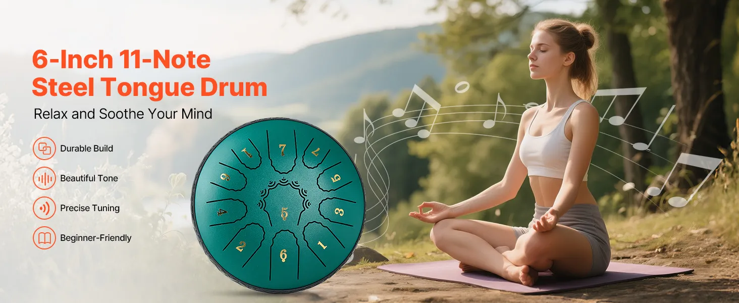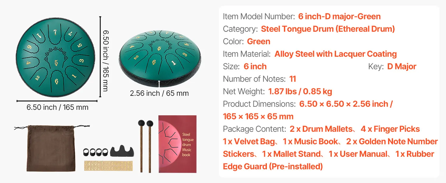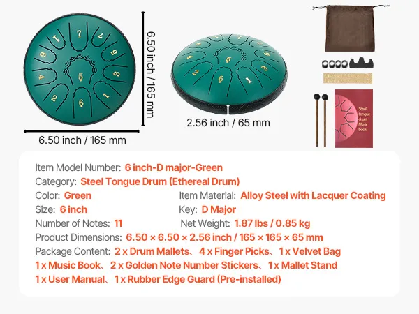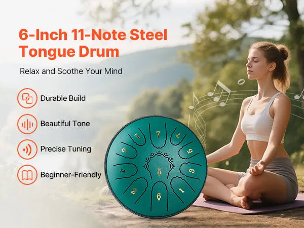 VEVOR Steel Tongue Drum, 16.5cm 11 Notes Rain Drum for Outside Garden, D Major Musical Drums with Music Book & Mallets, Percussion Instrument for Meditation Yoga Beginner Musical Education, Green