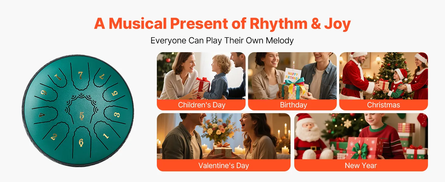 Our steel drum produces an ethereal and pure tone to heal the mind. It is a thoughtful choice for friends to relieve stress and find peace. For children, it sparks curiosity, nurtures musical sense, and supports early music education. Ideal present for birthdays, festivals, and anniversaries.