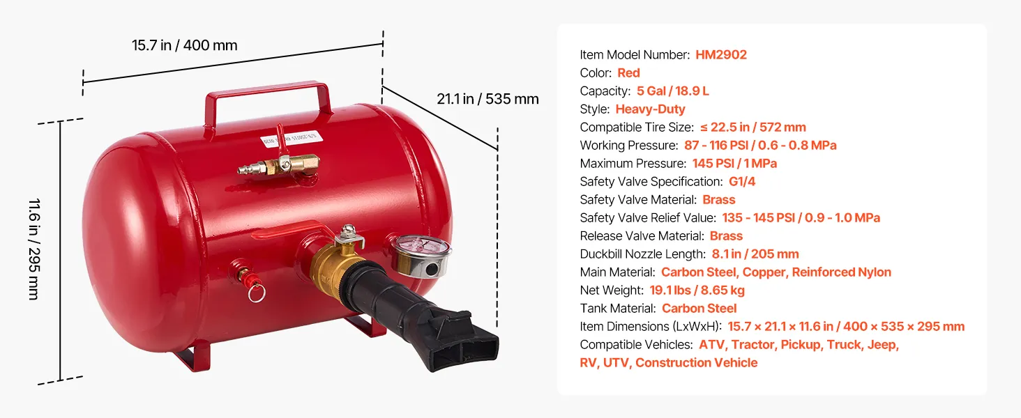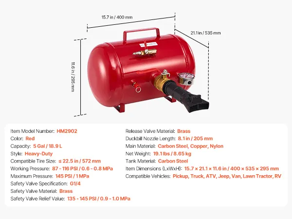 5 Gal / 18.9 L heavy-duty tire bead seater quickly releases high-pressure air, seating the tire bead in the correct position in just 1 second and making heavy tire bead sealing faster and easier.