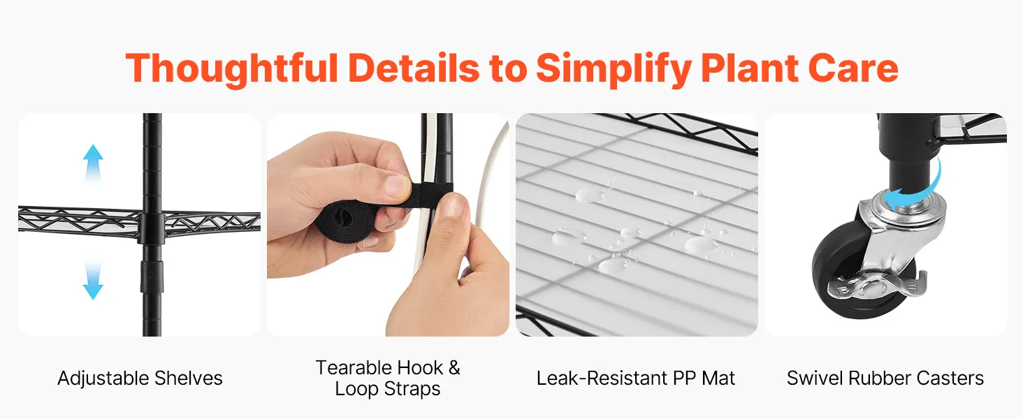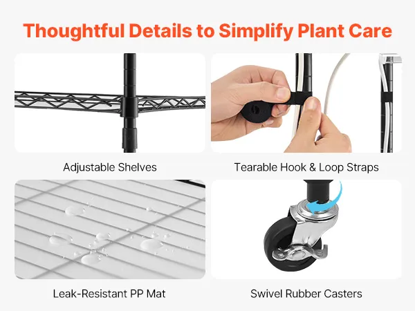 Adjustable shelves fit plants of various heights. hook-and-loop straps straps keep plants secure, leak-proof PP trays protect circuits, and swivel rubber casters make repositioning effortless.