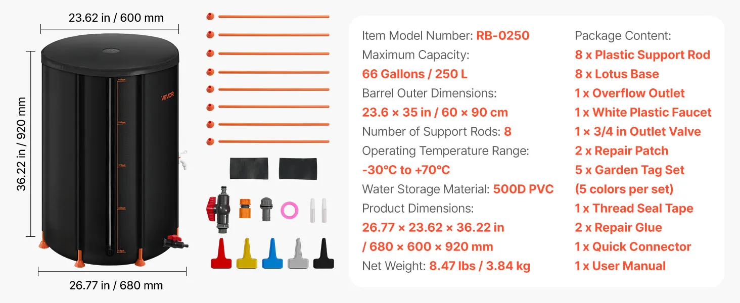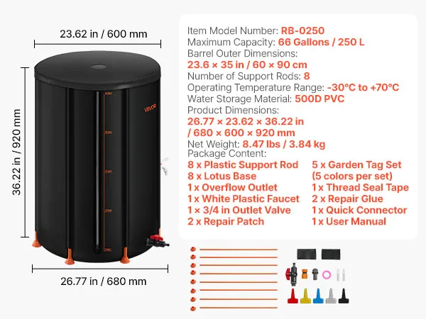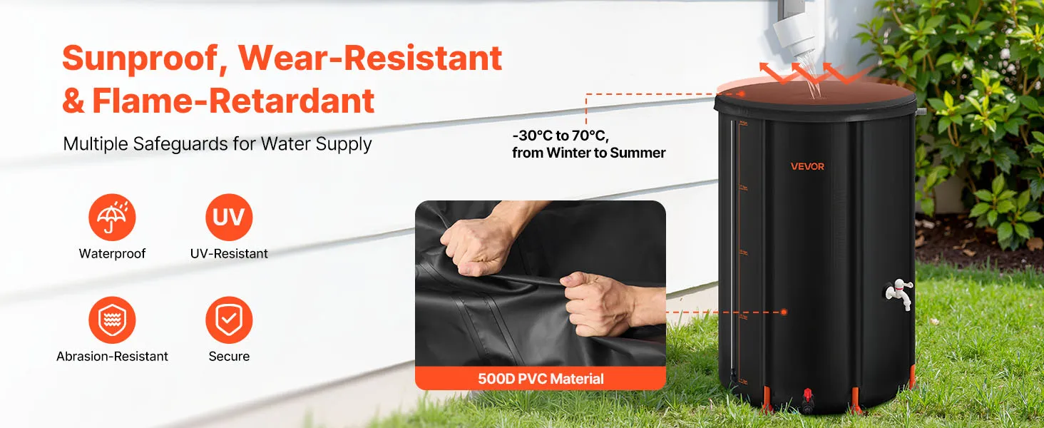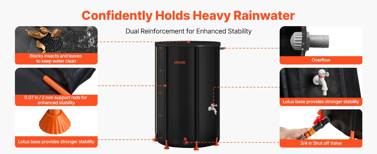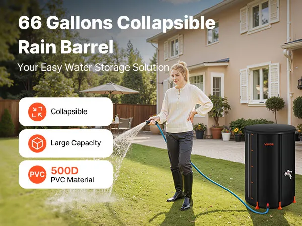 Our collapsible rain barrel, made of 500D PVC, offers durability and convenience. It features a lotus base, 2 mm support rods, mesh top, pre-installed outlet, acrylic gauge, and quick setup. Foldable for compact storage, it’s ideal for home, garden, farm, and emergency use.