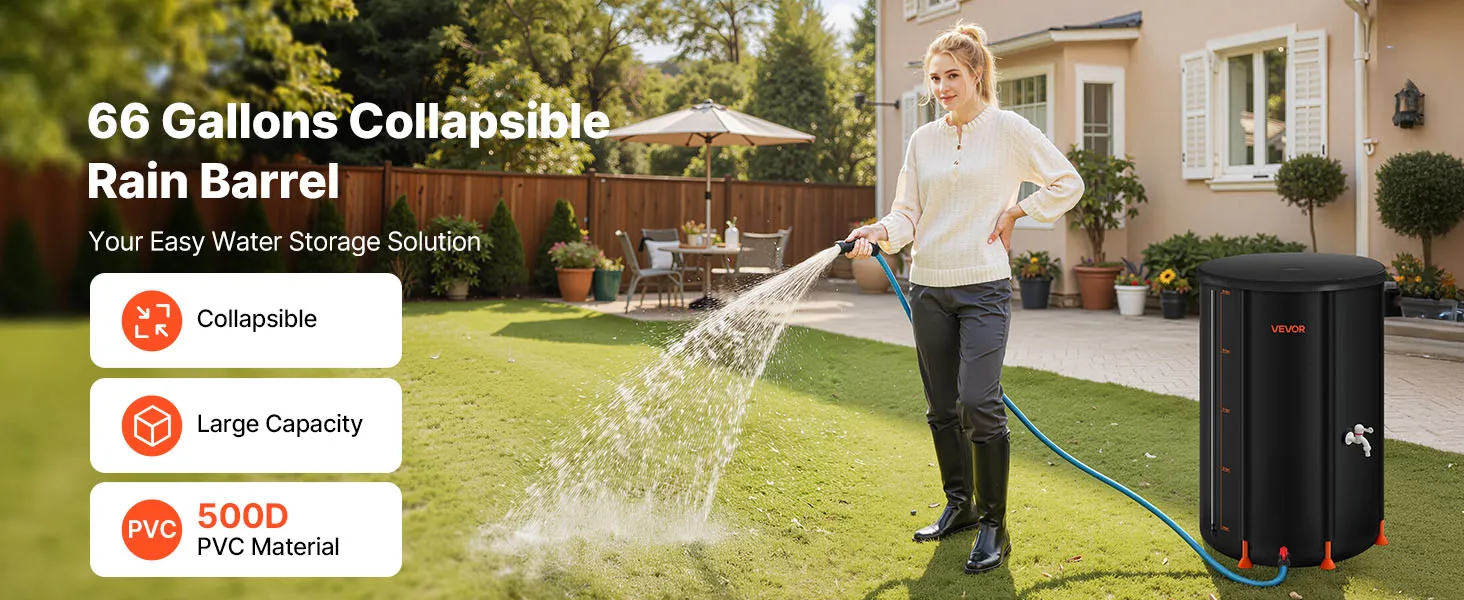 VEVOR Collapsible Rain Barrel, 250 L Portable Rain Water Collection Barrel, 500D PVC Rainwater Collection System, Garden Water Catcher Tank Storage Container with Spigot & Overflow Kit, Black