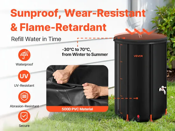 This collapsible water barrel is crafted from 500D PVC, offering rainproof, UV-blocking, wear-resistant, and non-toxic features. With a working temperature range of -30℃ to +70℃, it performs reliably in both hot summers and freezing winters.