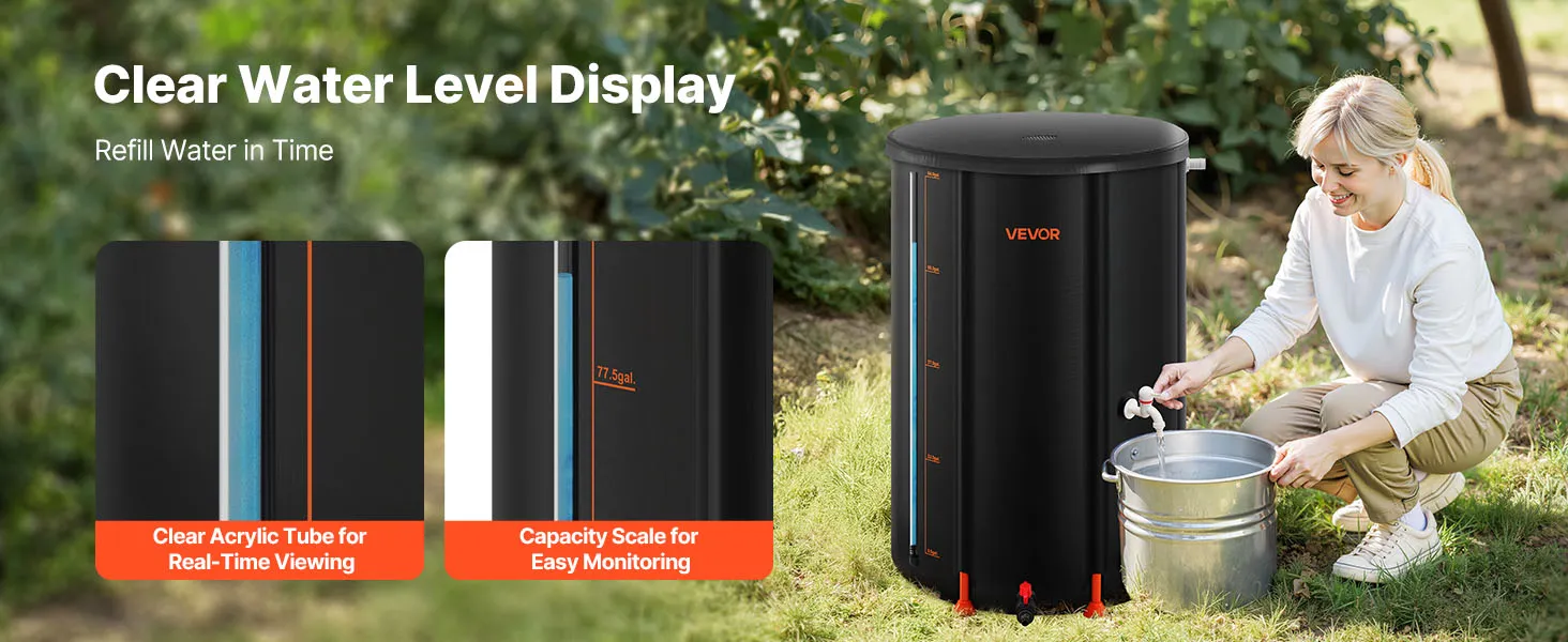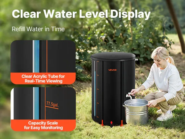 Our rain collection system features an acrylic transparent tube with clear markings, so you can check water levels anytime without opening the lid, refill in time, and avoid running out when water is needed most.
