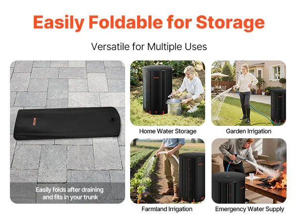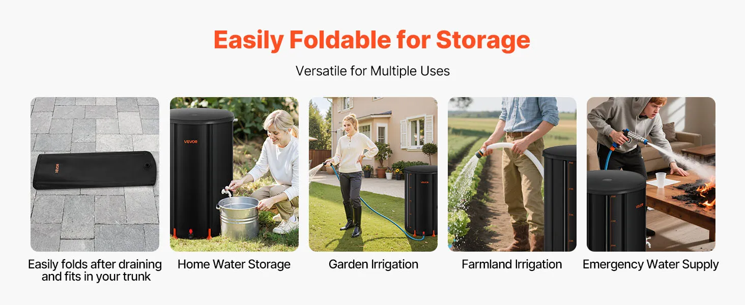 After draining, this rain barrel folds into a compact size for storage in small spaces like a car trunk. Its versatility makes it ideal for household storage, garden irrigation, farmland watering, or as an emergency water source.