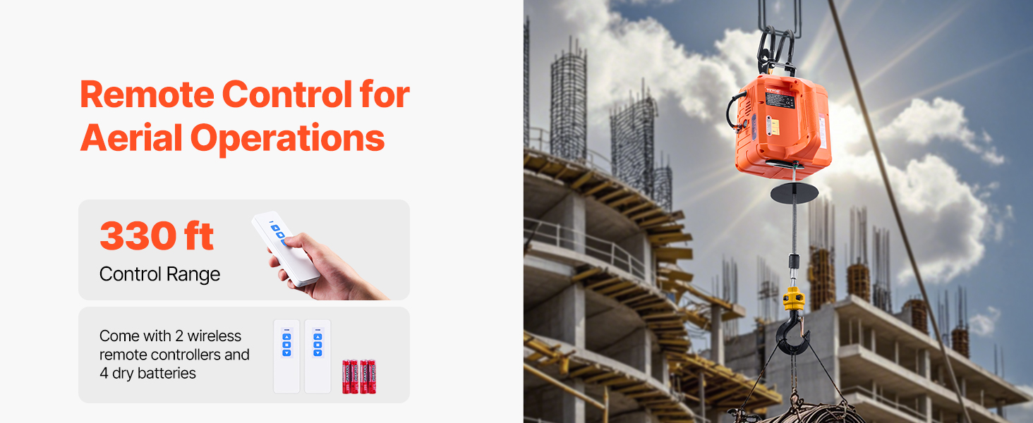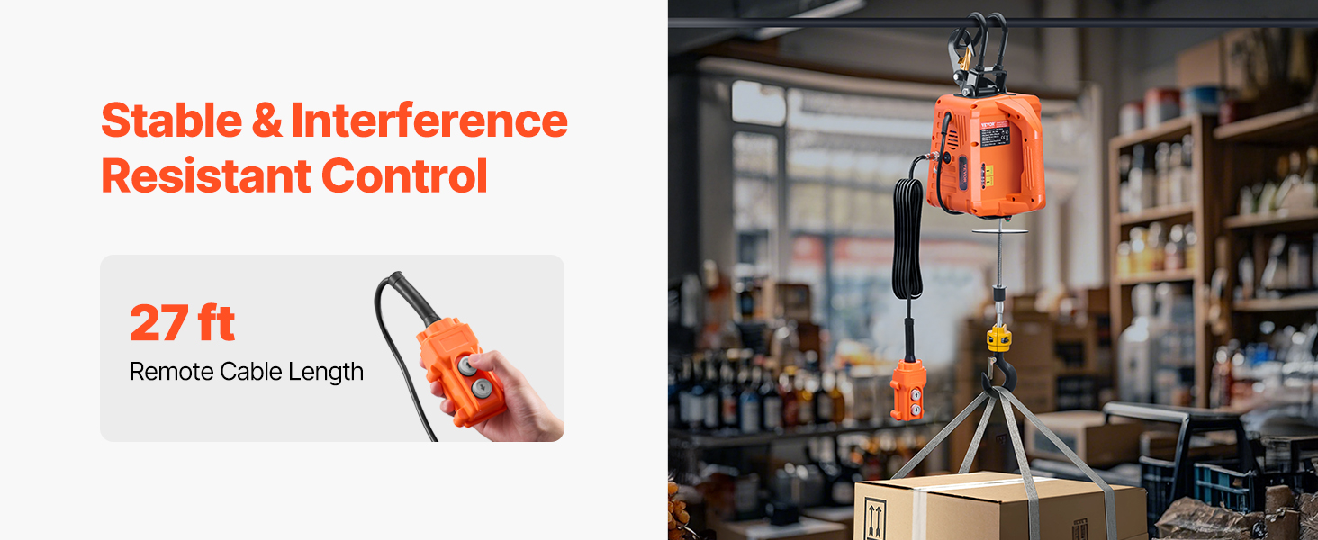See kaasaskantav elektriline tõstuk on mootor 1500W, 1100 lbs / 500 kg võimsus ja tõstekõrgus kuni 30 jalga / 9.1 m. See pakub manuaal, juhtmega (27 jalga) ja wireless (330 jalga) kontrolli. 2,2-tolline topelt konks tagab stabiilsuse erinevaid ülesandeid.