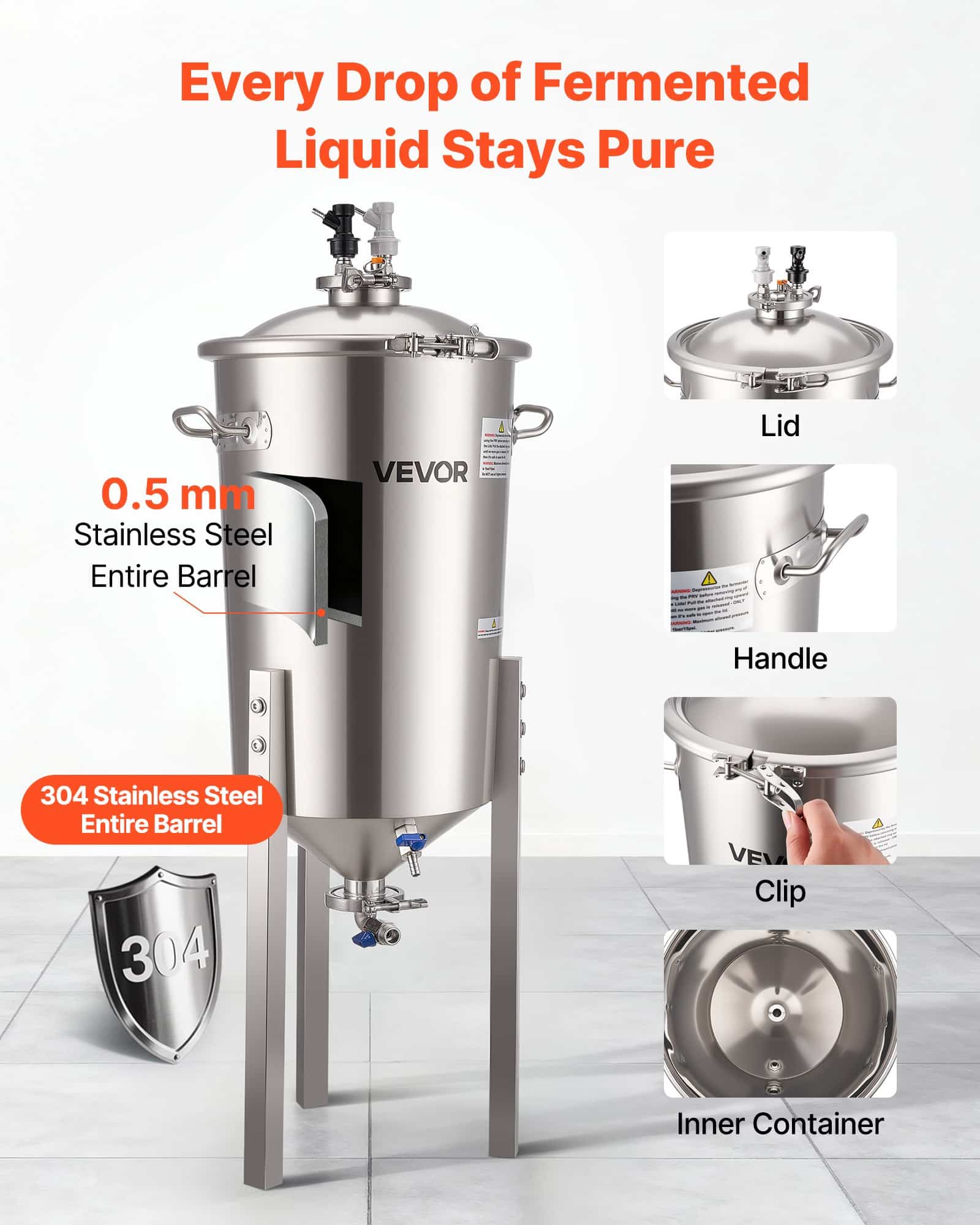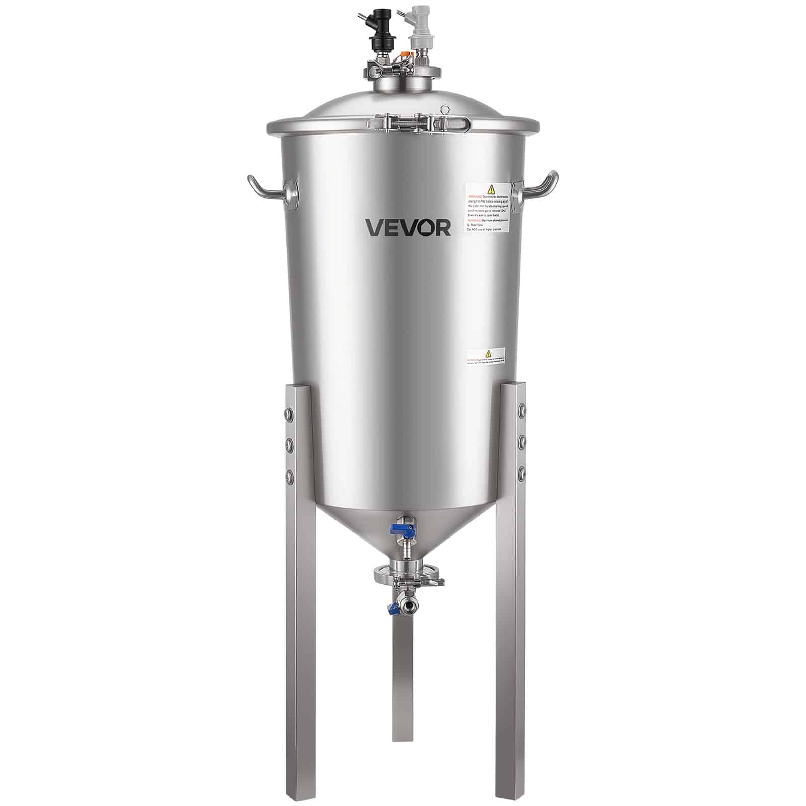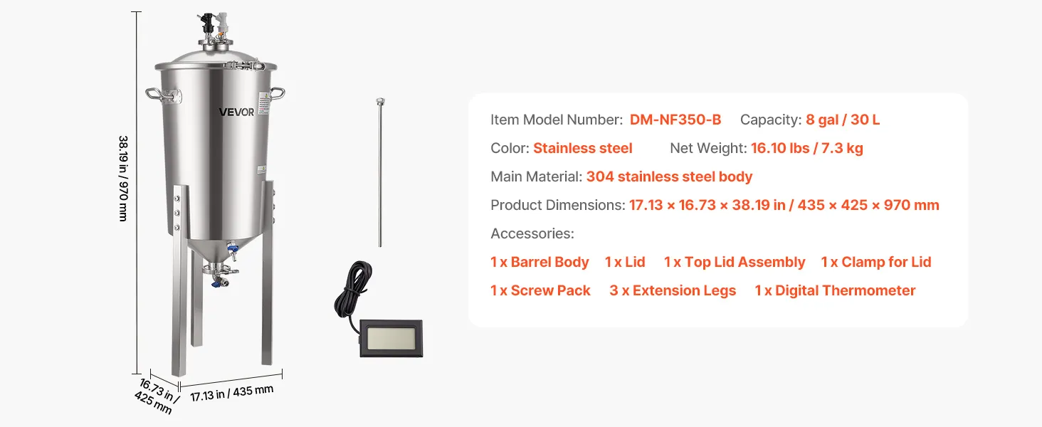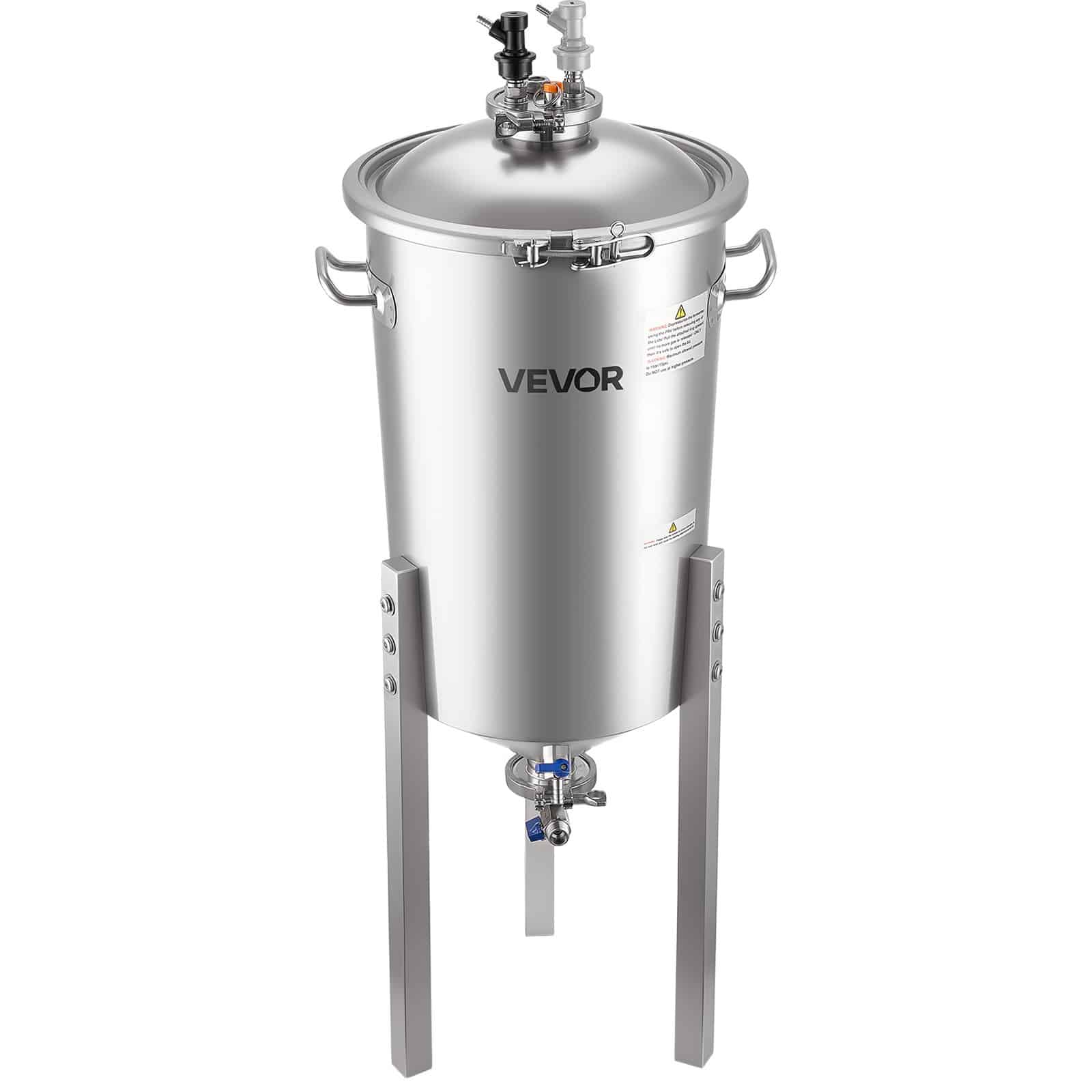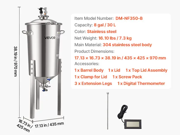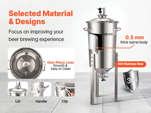 VEVOR roostevabast terasest kooniline fermentaator, 8 Gal/30L kodupruulimise fermenatsioonipaak, koonilise põhjaga pruulikopa fermentaator, 3 reguleeritavat jalga, kaas, käepide ja termomeeter, veini, õlle kääritamiseks