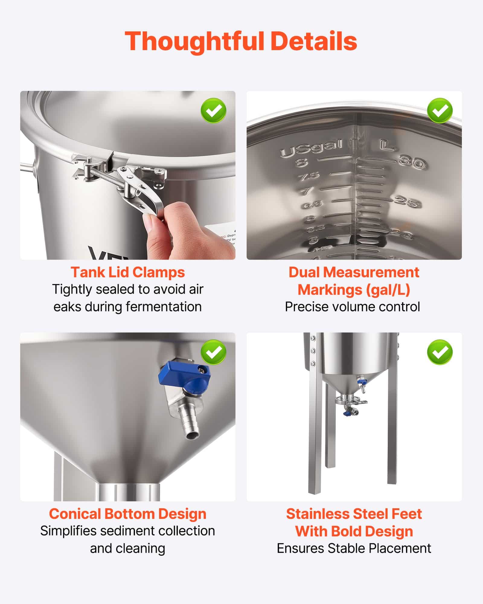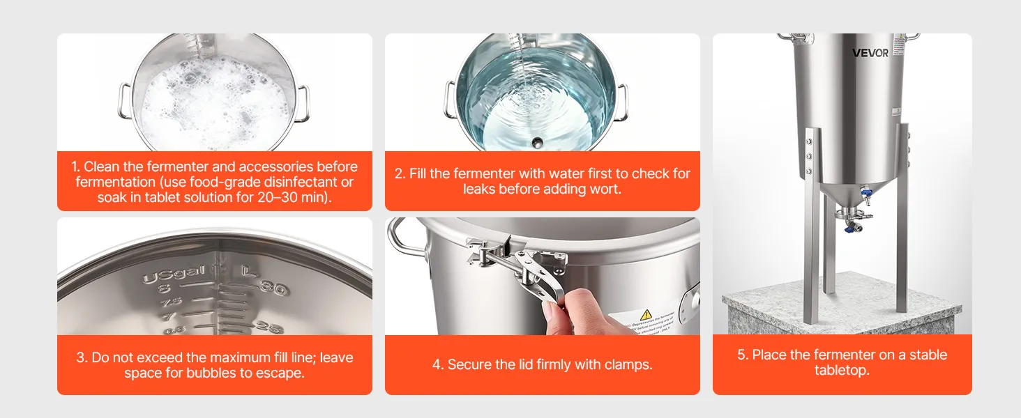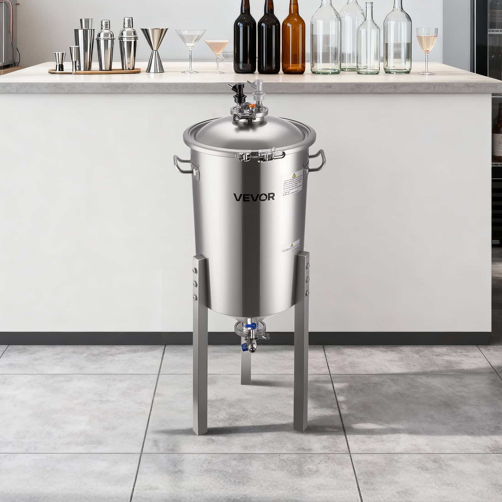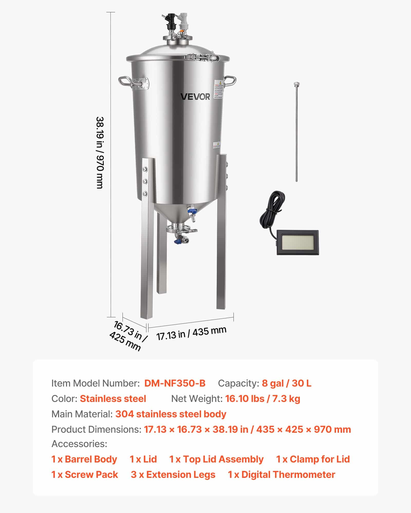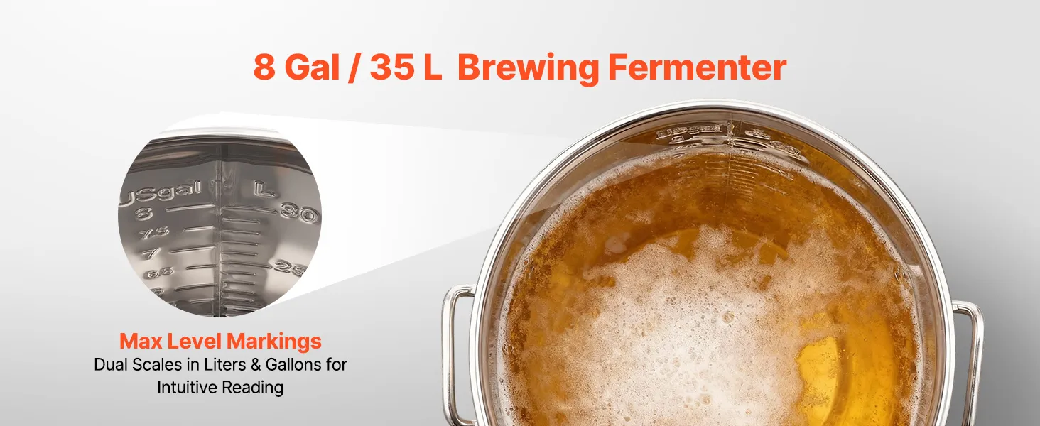 VEVOR roostevabast terasest kooniline fermentaator, 8 Gal/30L kodupruulimise fermenatsioonipaak, koonilise põhjaga pruulikopa fermentaator, 3 reguleeritavat jalga, kaas, käepide ja termomeeter, veini, õlle kääritamiseks