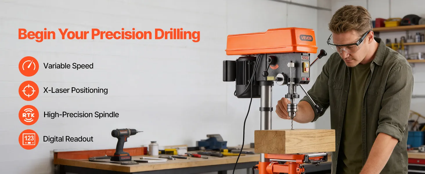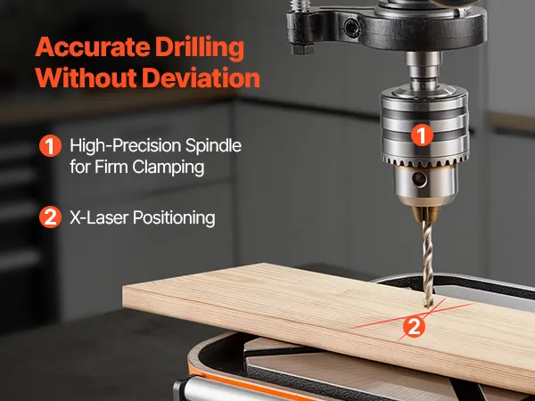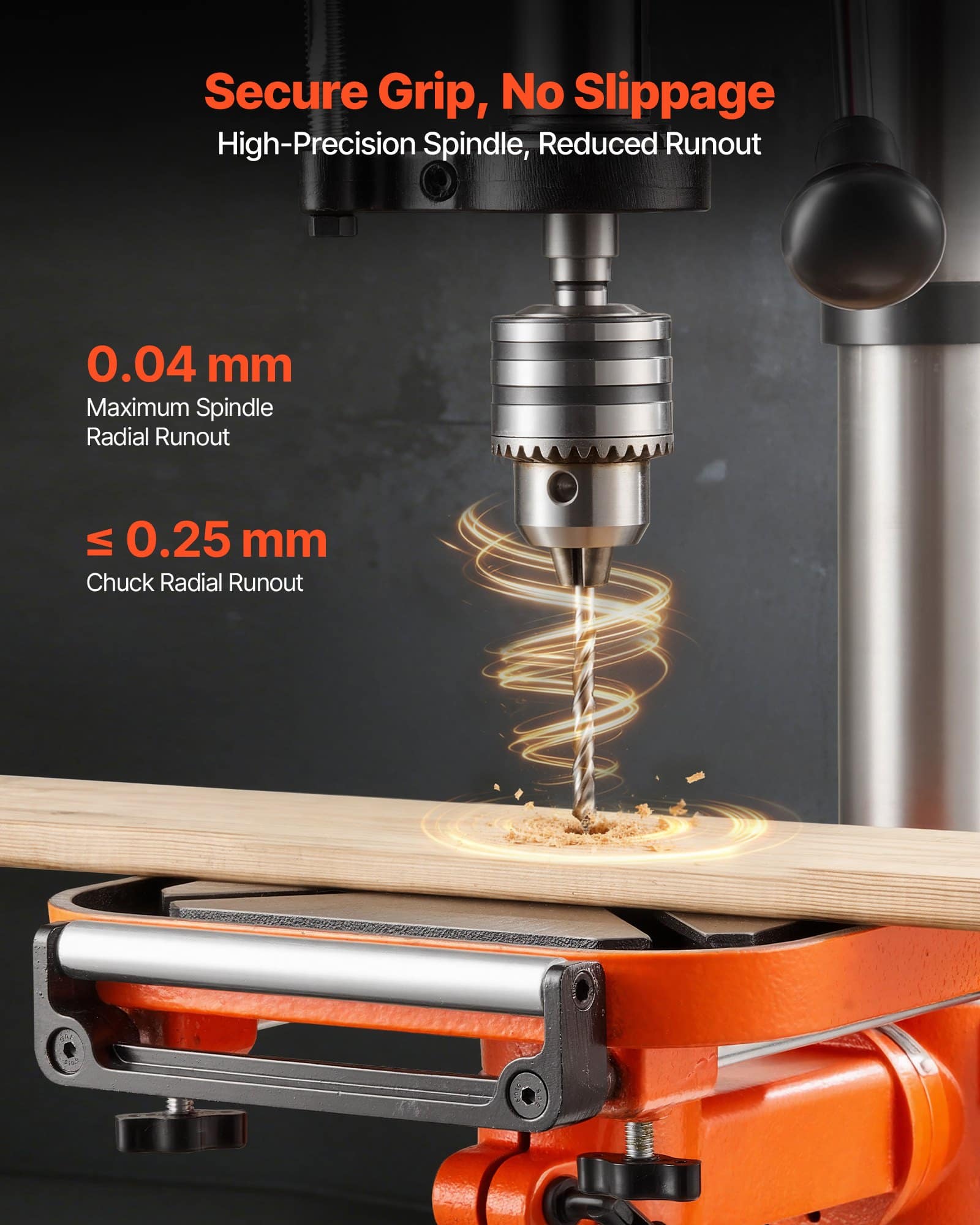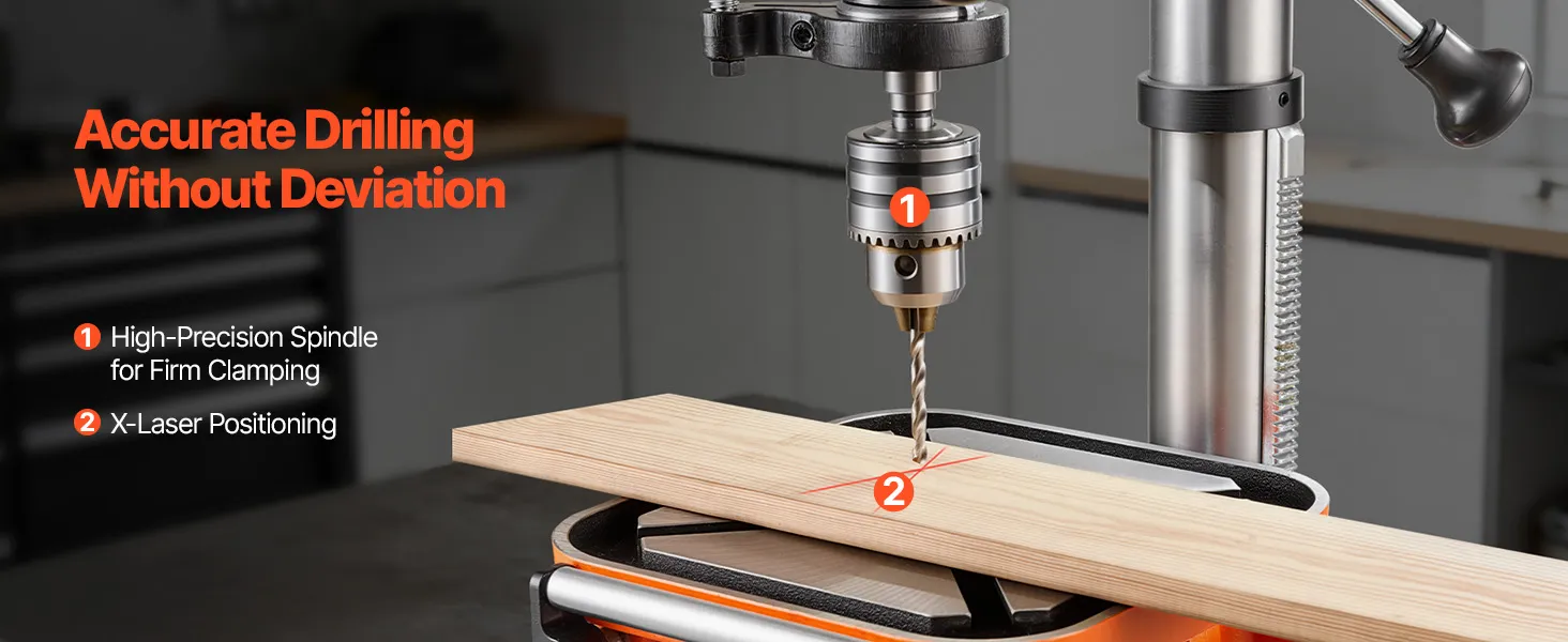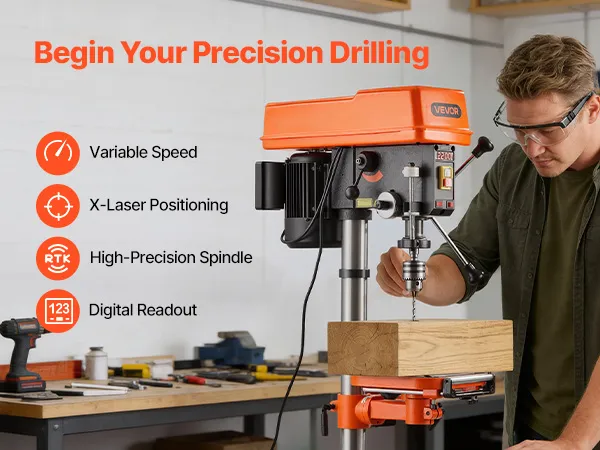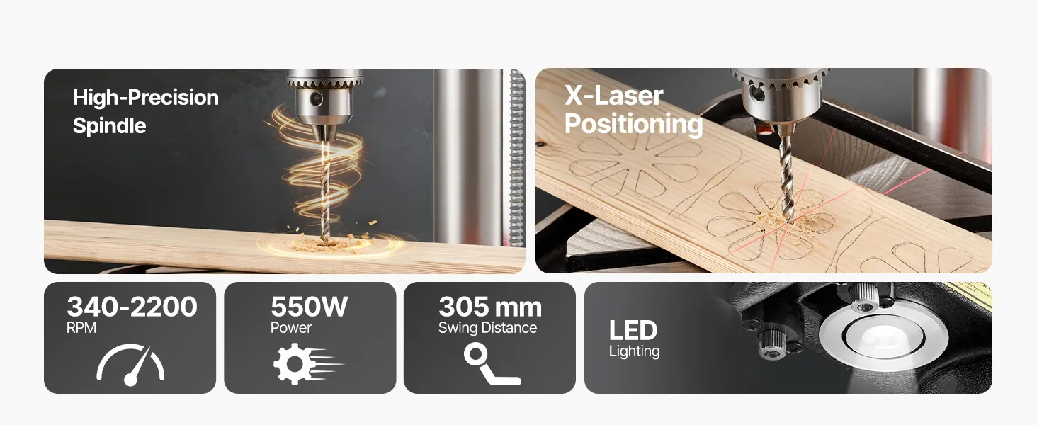 Equipped with a high-precision spindle, X-laser positioning, and LED lighting, this benchtop drill press delivers smooth, low-vibration drilling for accurate results. With a 305 mm swing and adjustable speeds from 340 to 2200 RPM, it handles different materials and tasks with high efficiency.