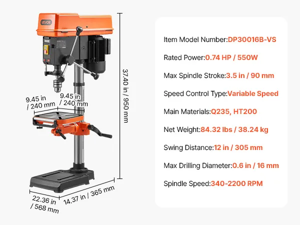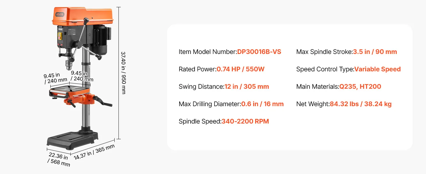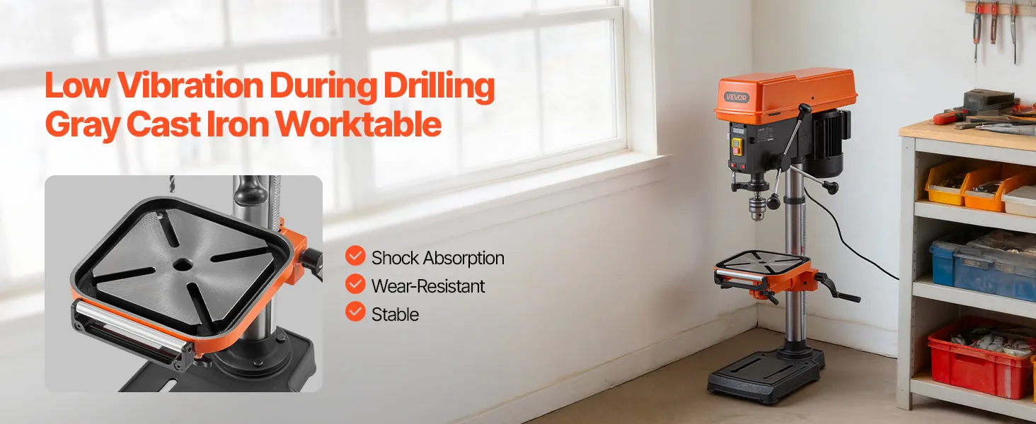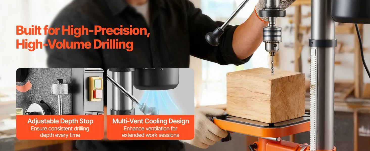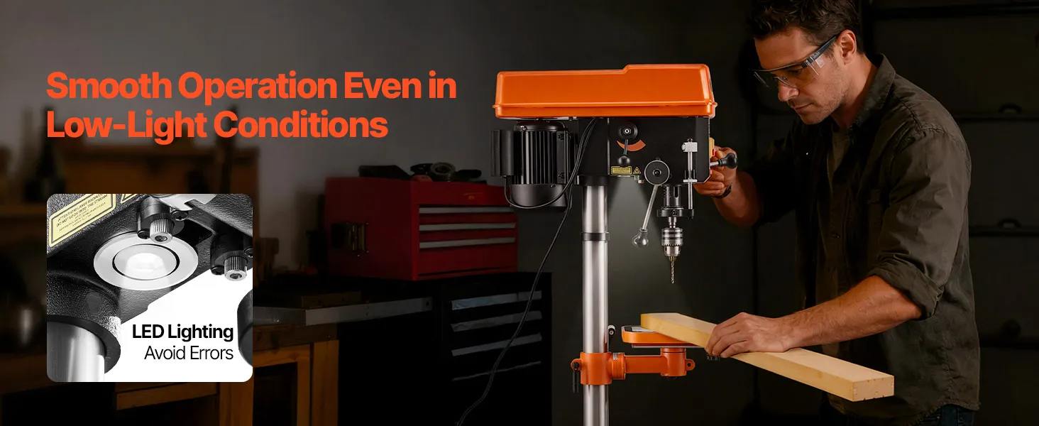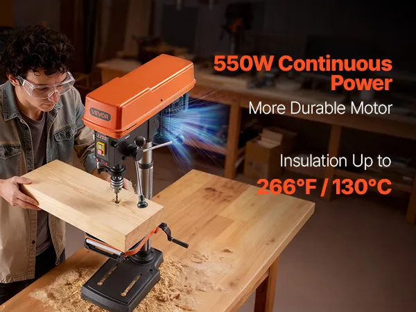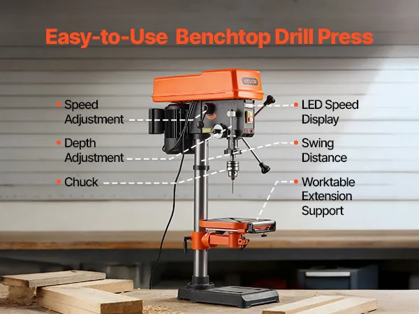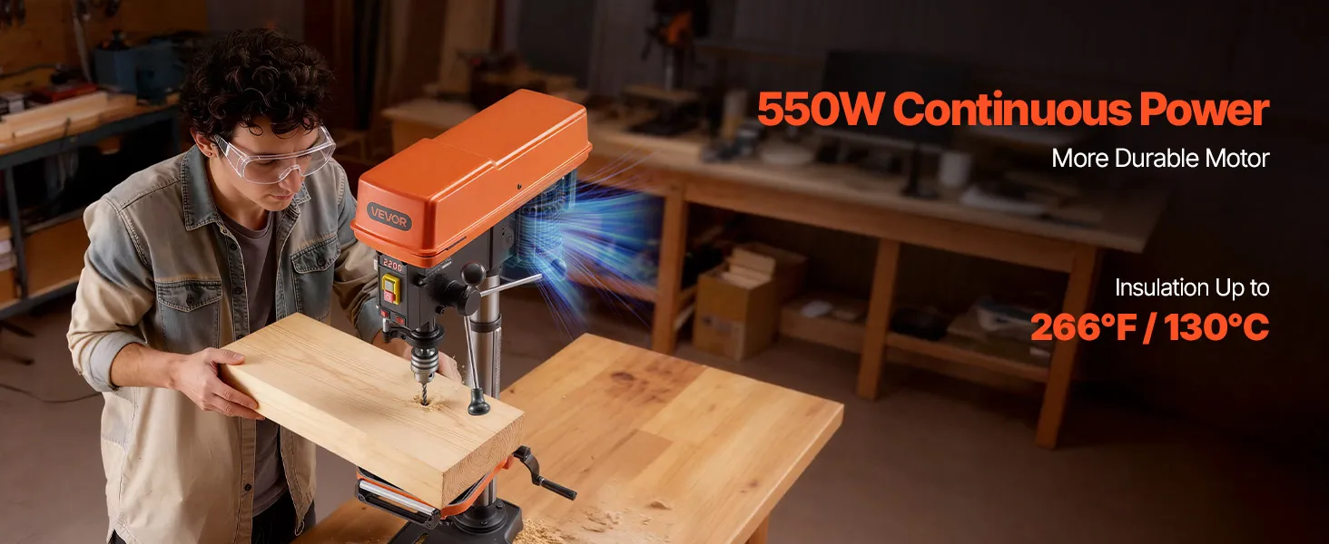 Equipped with a high-precision spindle, X-laser positioning, and LED lighting, this benchtop drill press delivers smooth, low-vibration drilling for accurate results. With a 305 mm swing and adjustable speeds from 340 to 2200 RPM, it handles different materials and tasks with high efficiency.