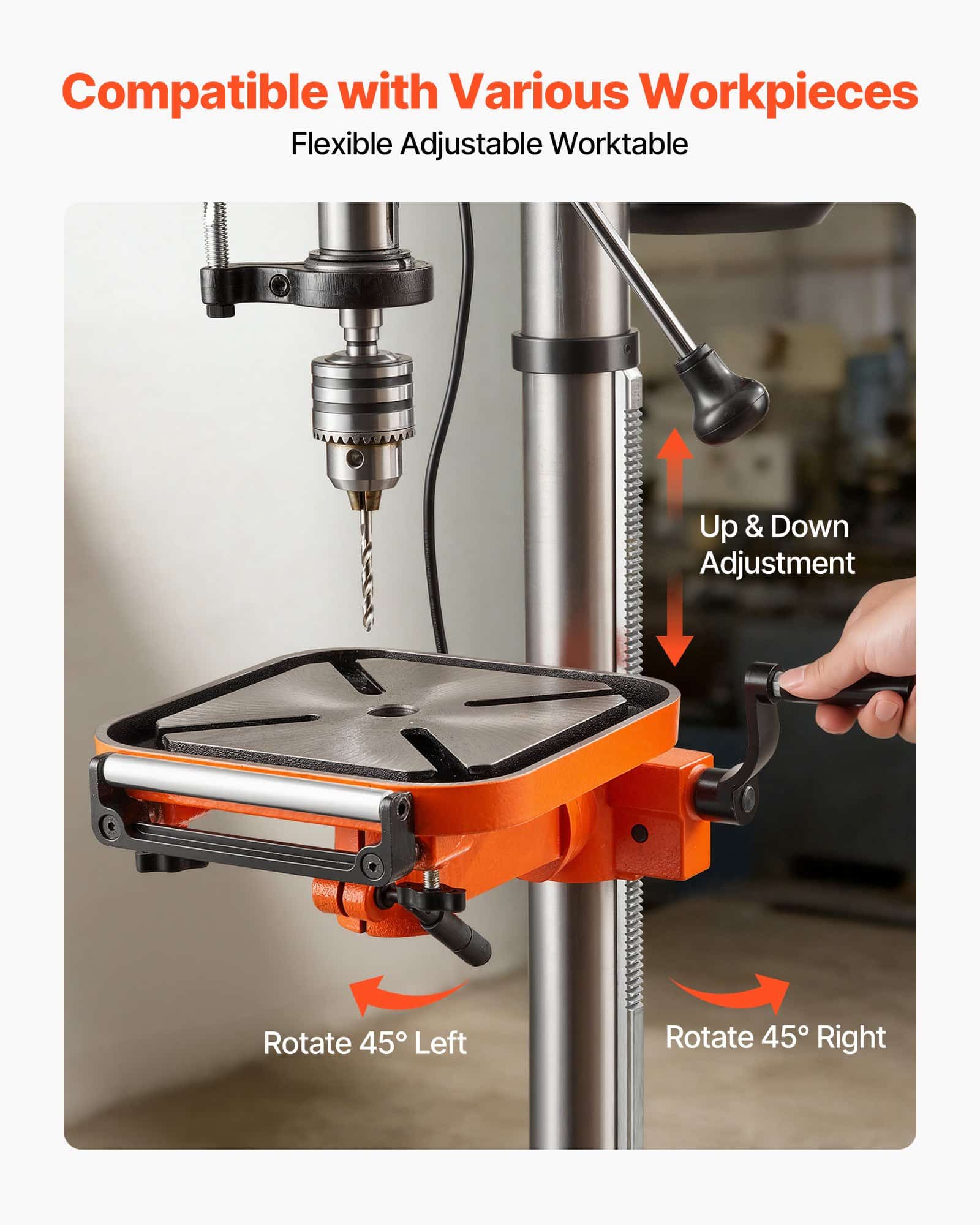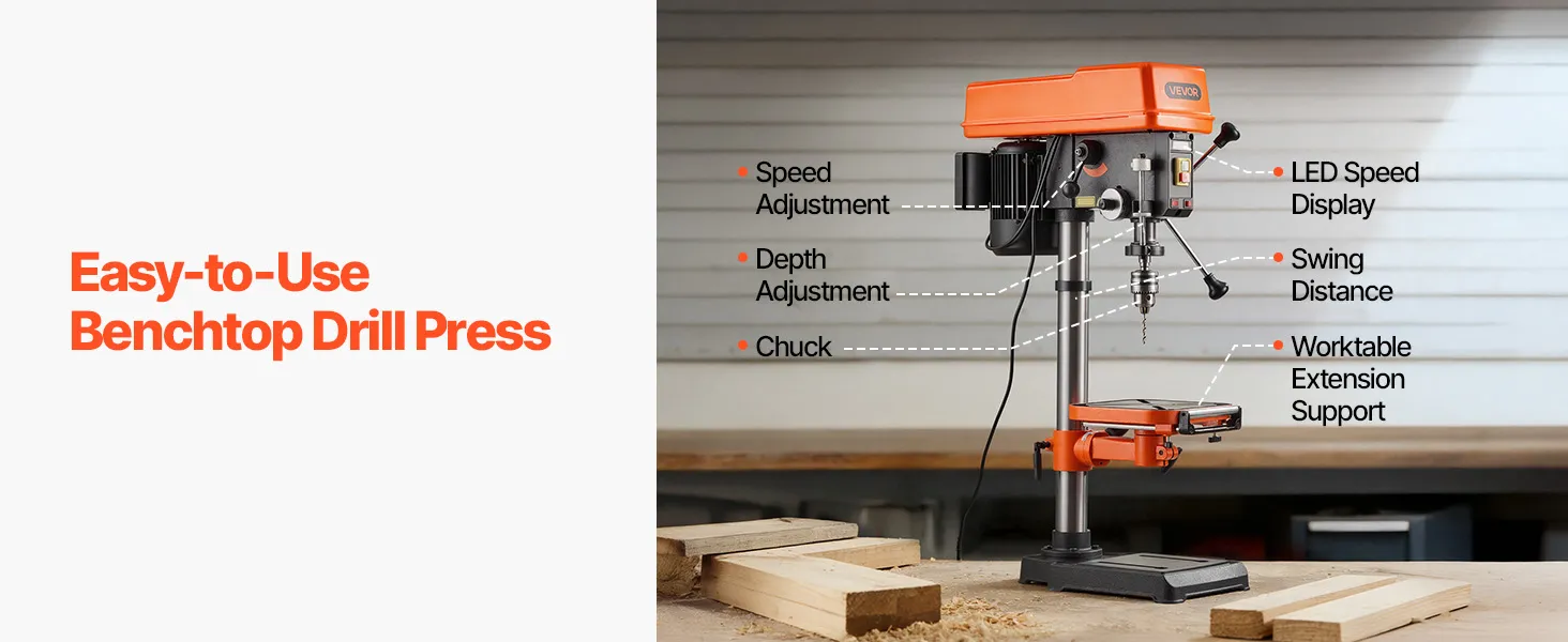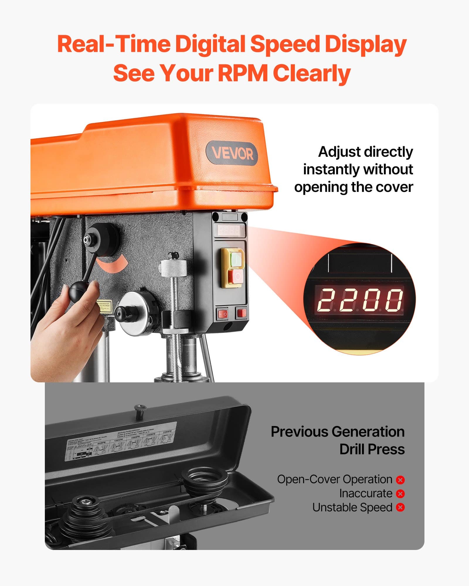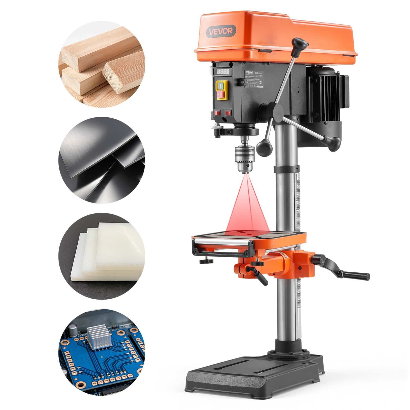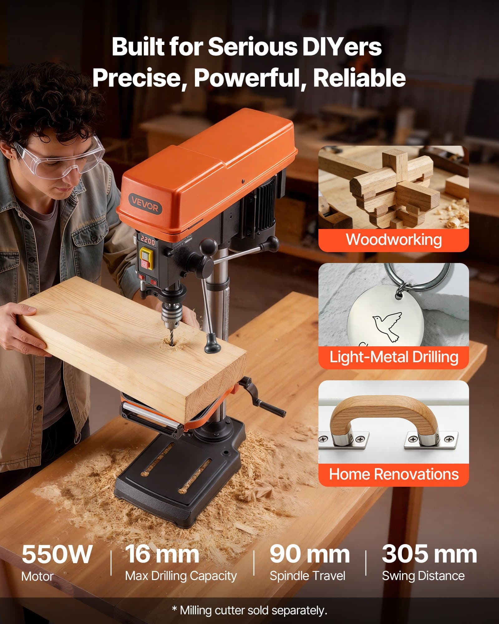 VEVOR 305 mm Benchtop Drill Press, 550W, Bench Drill Press, 340 to 2200 RPM Variable Speed, 0-45° Tilting Worktable, with Laser and LED Work Light, Tabletop Drilling Machine, for Woodworking, Metal