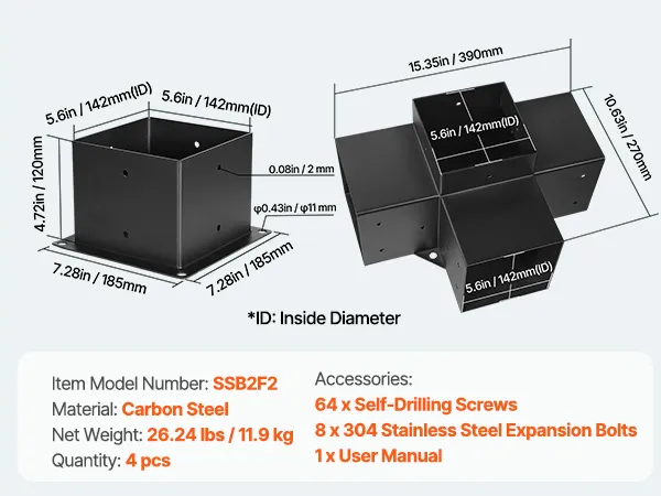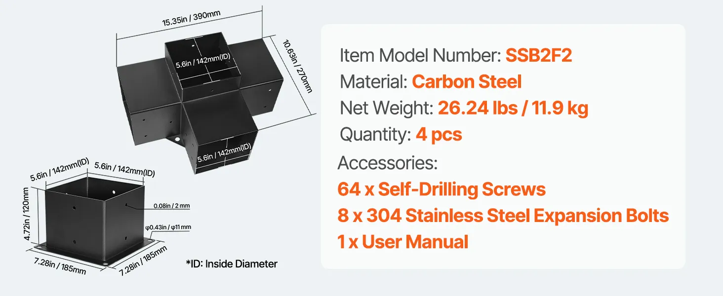 VEVOR Pergola Bracket Kit, 6x6 Inch (Inner Size 142 x 142 mm), 2 Pcs 4-Way Heavy Duty Corner Bracket Woodworks DIY Post Base Kit, Easy Installation Wooden Beams for Gazebos, Patio Pergolas, Log Cabin